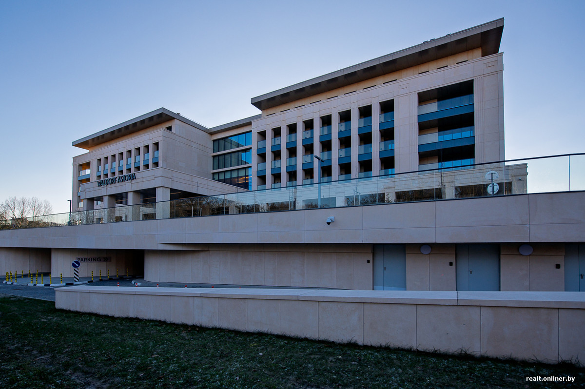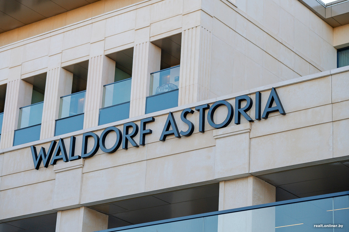 Надписи Waldorf Astoria просматриваются отовсюду. Напомним, что под брендом Hilton работают сотни гостиниц различных категорий по всему миру. Например, в Минске есть пятизвездочный DoubleTree by Hilton, трехзвездочный Hampton by Hilton, четырехзвездочный The Basilian by Hilton.