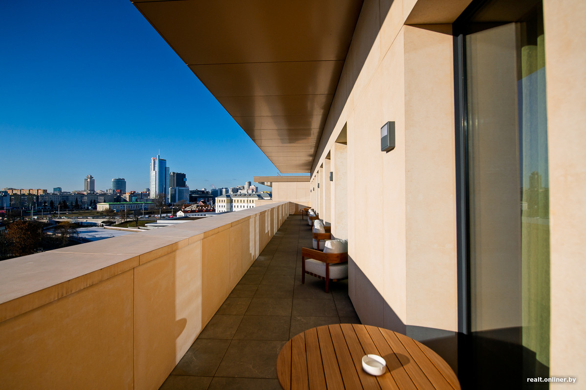 Самый дорогой номер — это традиционно Presidential Suite. Он занимает треть пятого этажа, имеет площадь 282 «квадрата» и выделяется наличием трех спален и просто бесконечной панорамной террасы. В мастер-спальне стоит не просто кровать, а кровать super king size. Кроме того, тут есть рабочий кабинет, большая гостиная с кухней, гардеробная. Стоимость президентских апартаментов — от $3000 в сутки.
