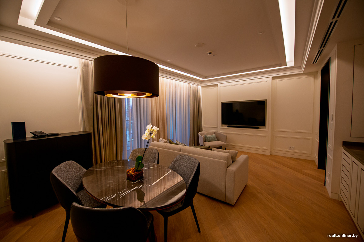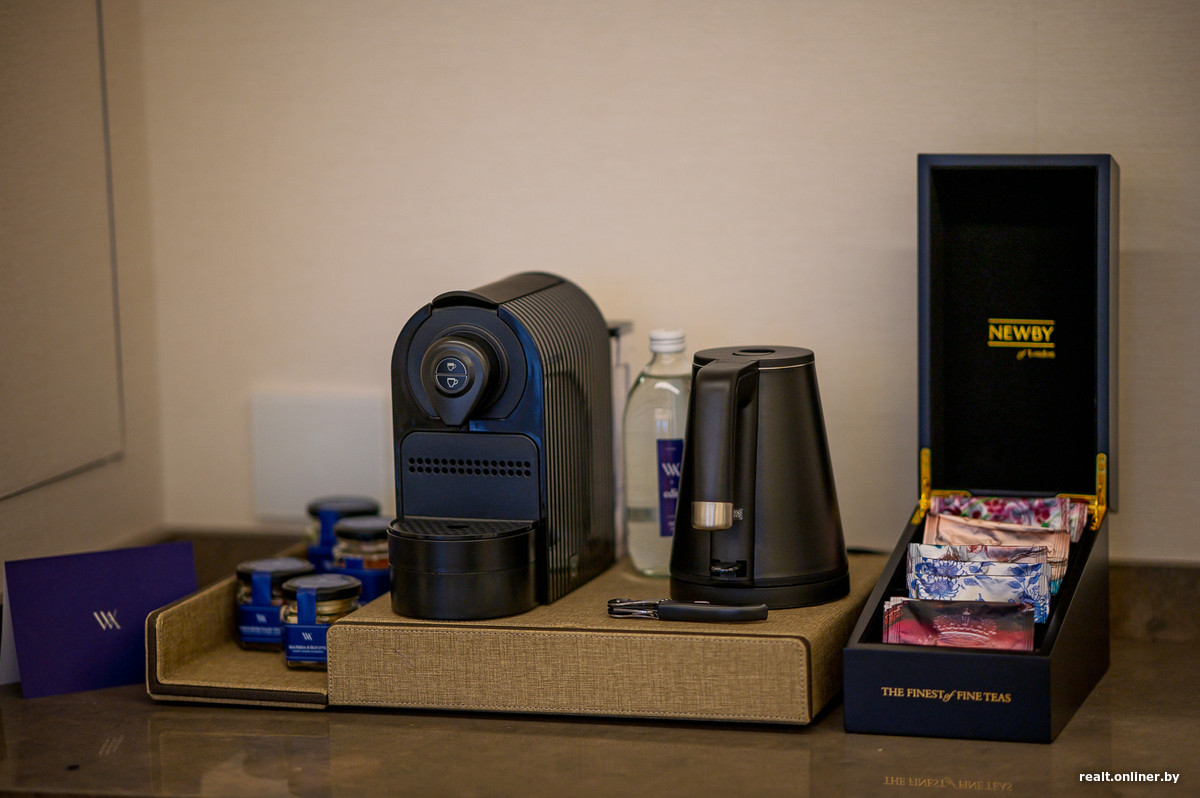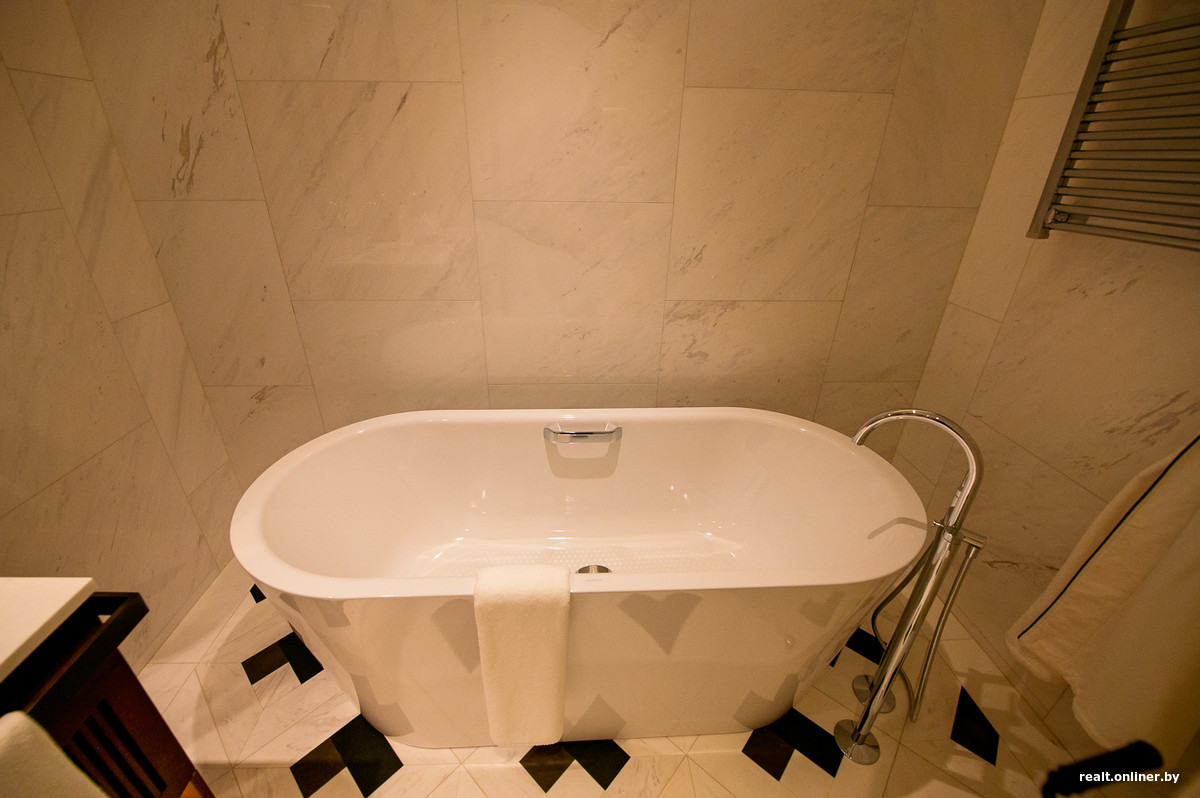 Отмечается: несмотря на то что интерьеры во всех Waldorf Astoria имеют общие черты, из города в город они реализуются с отличительными особенностями. Создавая интерьер минских номеров, дизайнеры учитывали минский менталитет, архитектуру города. Получилась такая сдержанная неоклассика.