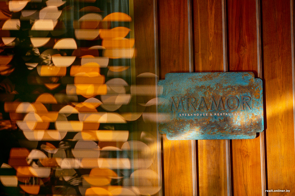 Бар Peacock в холле — далеко не единственное гастрономическое заведение в отеле. Интригует своей нарочито состаренной вывеской ресторан-стейкхаус Mramor, в котором будут готовить стейки и авторские блюда премиум-класса. Его открытие запланировано на январь 2026 года. Он расположится в той самой стеклянной пристройке над рекой. Внутри будет 50 посадочных мест, а на террасе — 34.