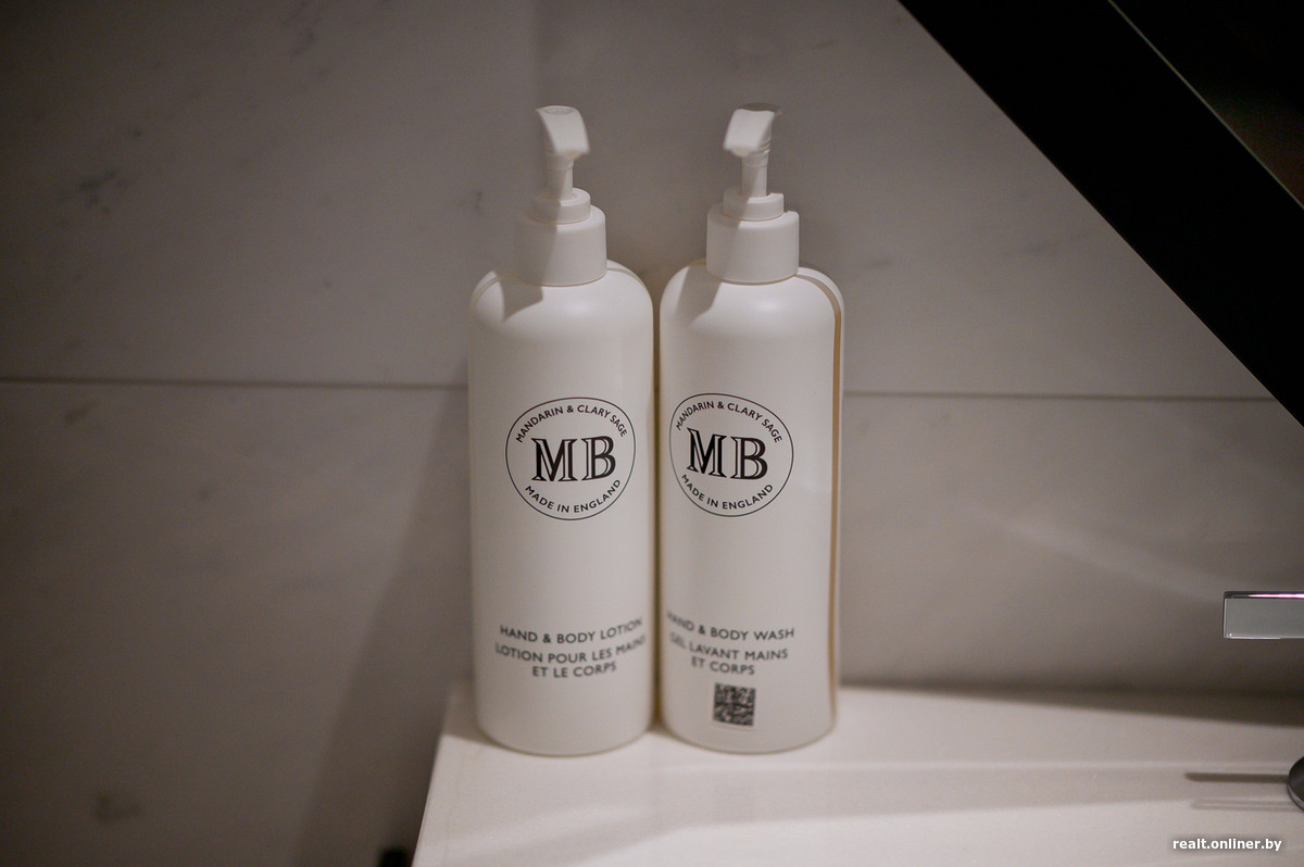 Ванные комнаты, отделанные мрамором и деревом, особенные: в каждой обязательно есть две раковины и два зеркала. Баночки с шампунем, бальзамом и прочая банная атрибутика — исключительно британского бренда Molten Brown.