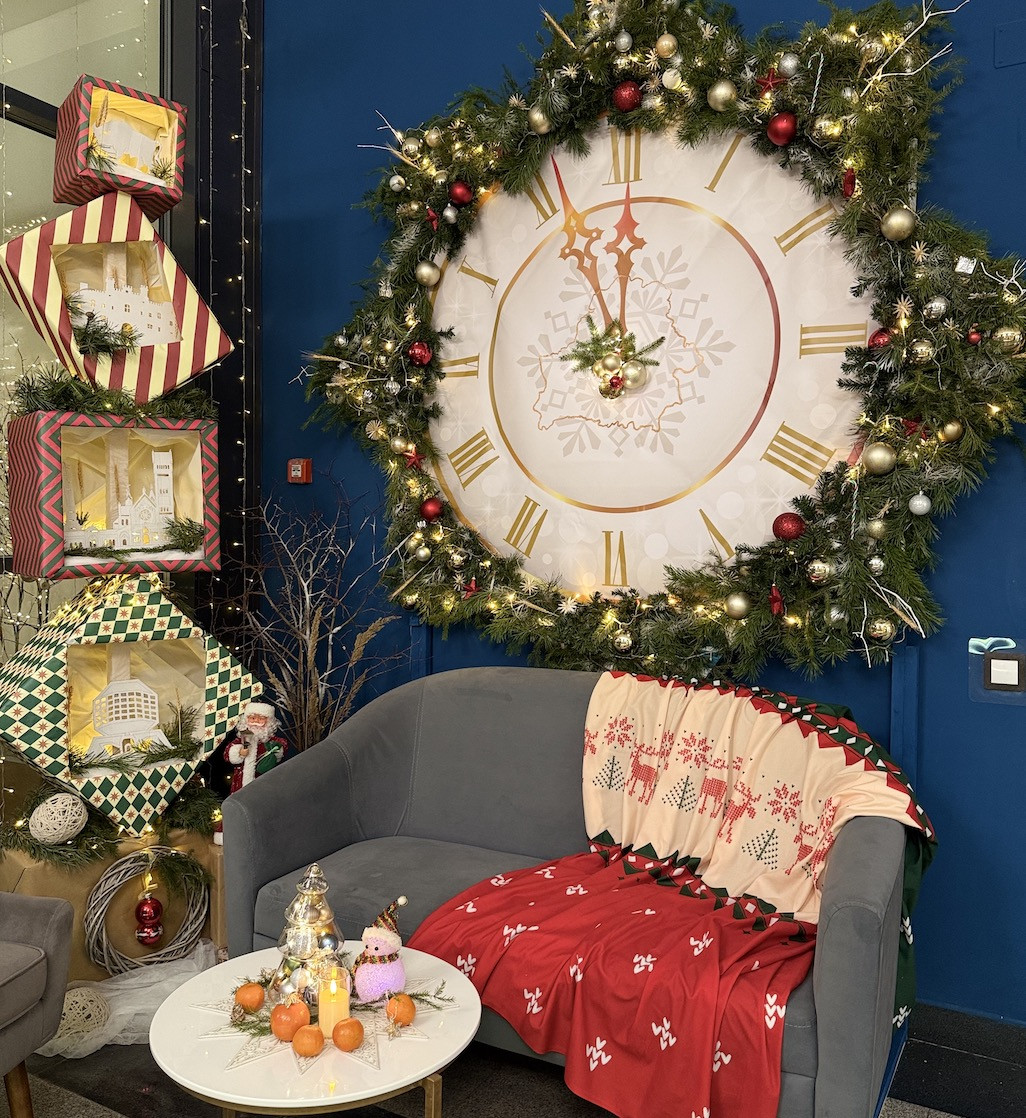 — Главная елка в этом году преобразилась — мы не смогли обойти вниманием модный тренд и сделали бусы из шаров в виде спирали, ведь это древний символ эволюции, созидания и роста. А так как этой зимой главным аксессуаром минчан стал зонт (дожди и туманы стали ежедневной традицией), в лобби появилась фотозоны с зонтом из еловых веток и милых сердцу игрушек.