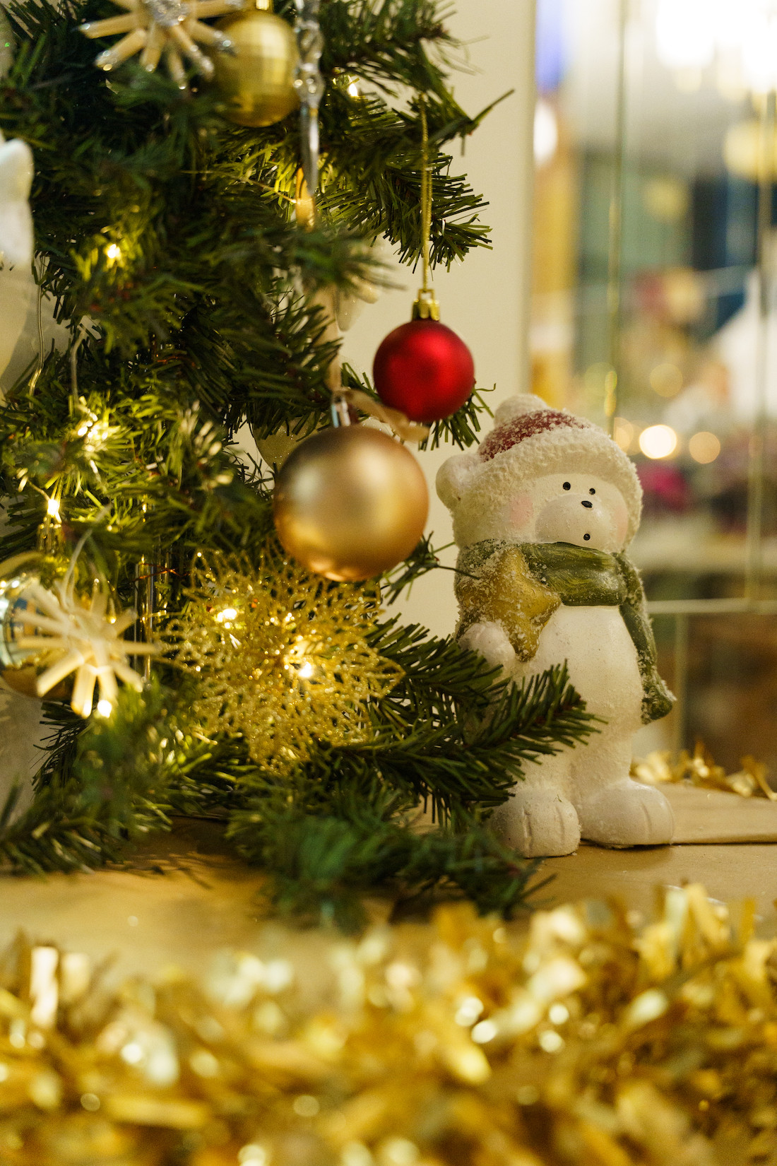 Так как лобби довольно просторное, в нем нашлось место для пирамиды из подарочных коробок, шаров — отсылок к кварталам «Минск-Мира», ветвям деревьев. И, конечно, множеству гирлянд и праздничных огоньков.