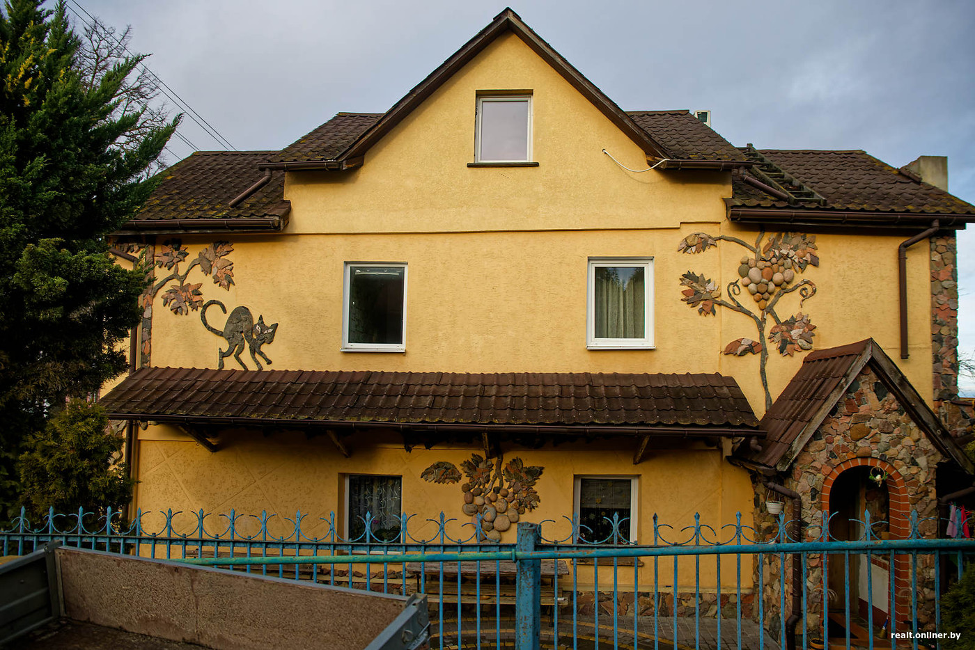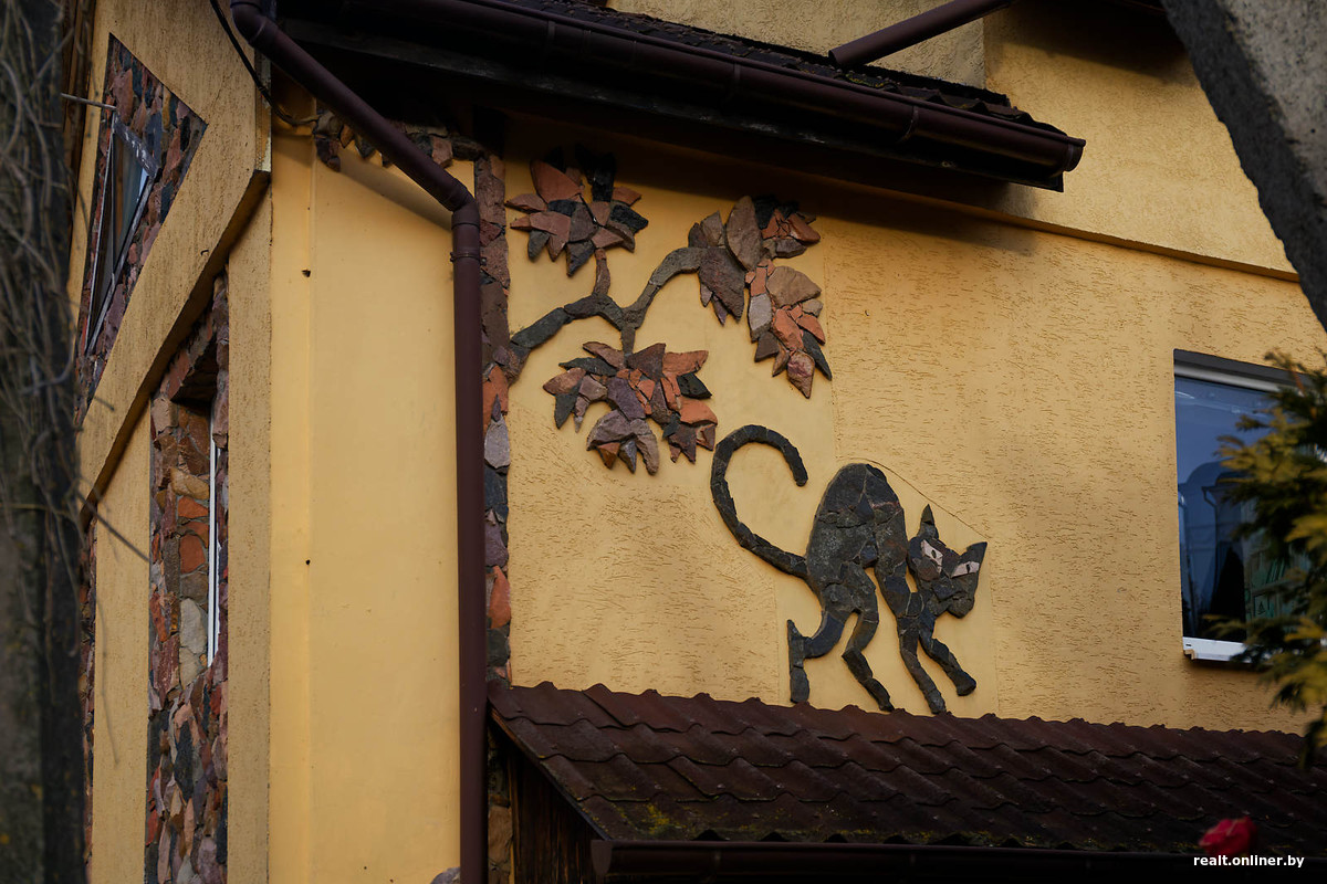 Власюки никогда не называют свой точный адрес. Зачем? Если вы приехали в Каменец, станьте спиной к знаменитой Белой веже, и в поле зрения обязательно попадет дом с котом. Так зовут здесь коттедж Галины и Владимира за мозаику на стене в виде черного кота в ершистой позе. Из булыжников на фасаде выложена виноградная лоза, натуральный камень — в отделке наличников, цоколя... Глядя на такой фантазийный вид строения, многие принимают его за сувенирную лавку, музей или кафе.