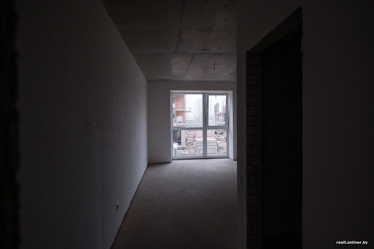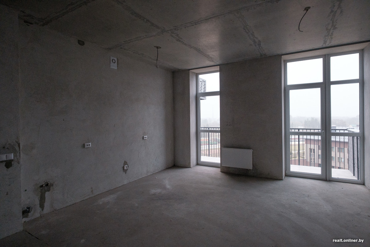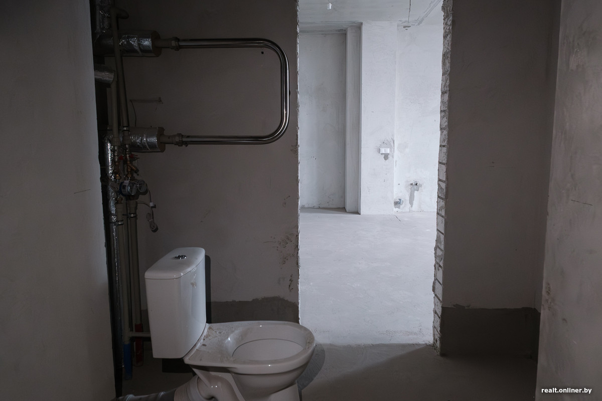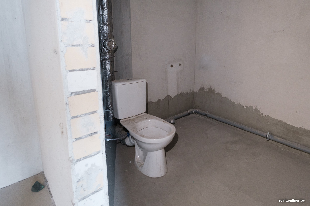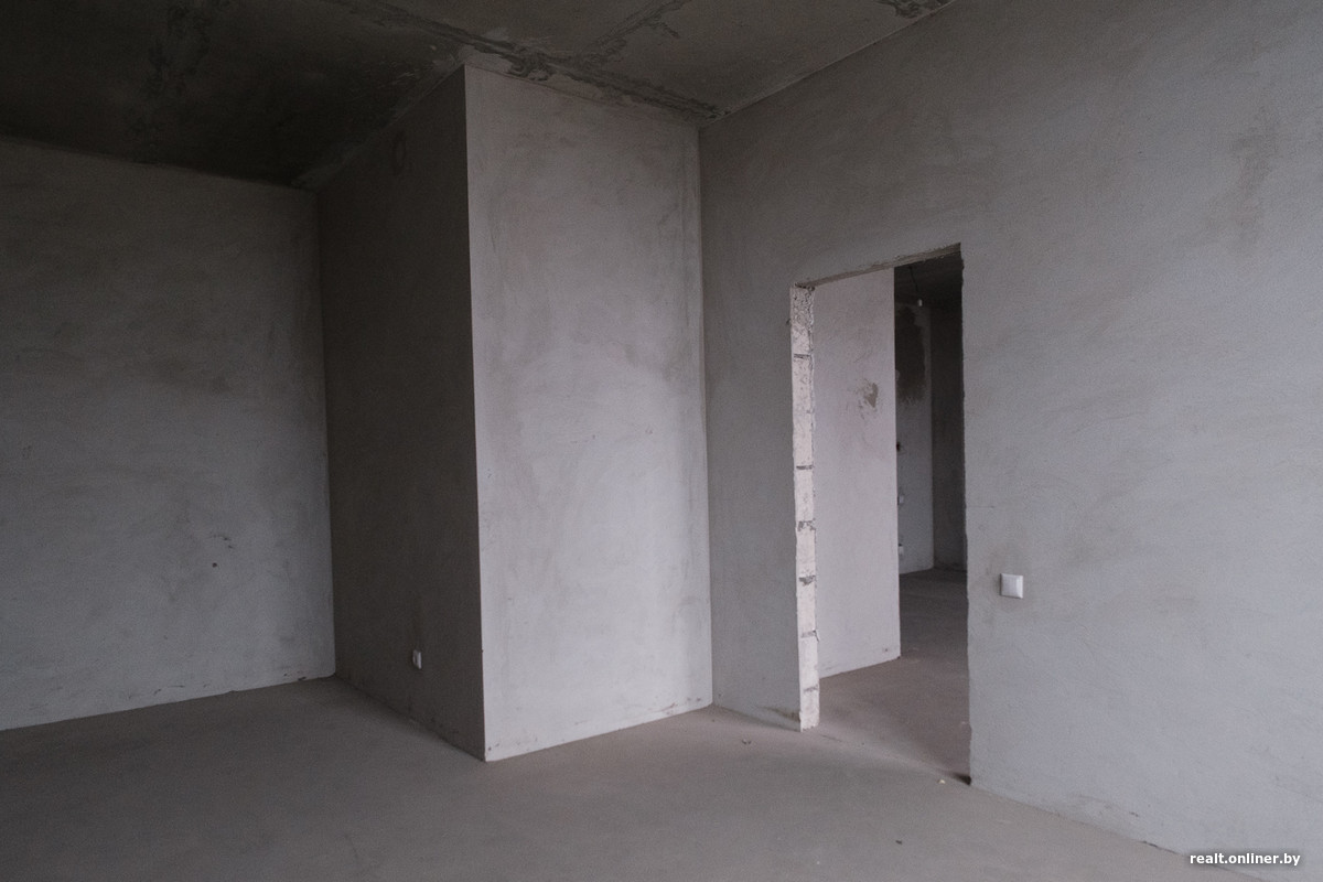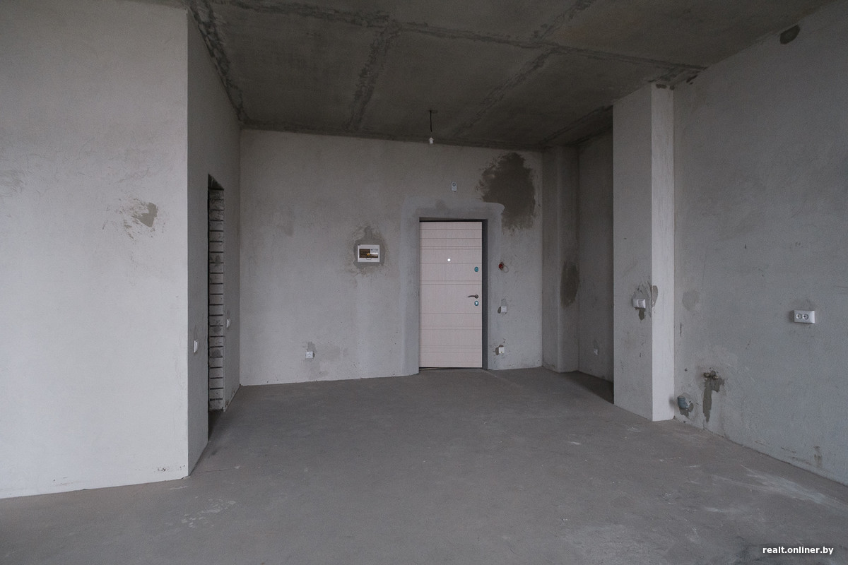 Заходим в квартиру площадью 58 квадратных метров. Отделка у жилья черновая: стяжка на полу, штукатурка на стенах, разведенная электрика, вывод под электроплиту, сантехническое оборудование. Планировки в доме не свободные — застройщик сам решил, где будет находиться спальня, а где лучше сделать кухню. Но очевидно, что возведенные перегородки при желании можно снести, чтобы раскроить пространство по-своему.