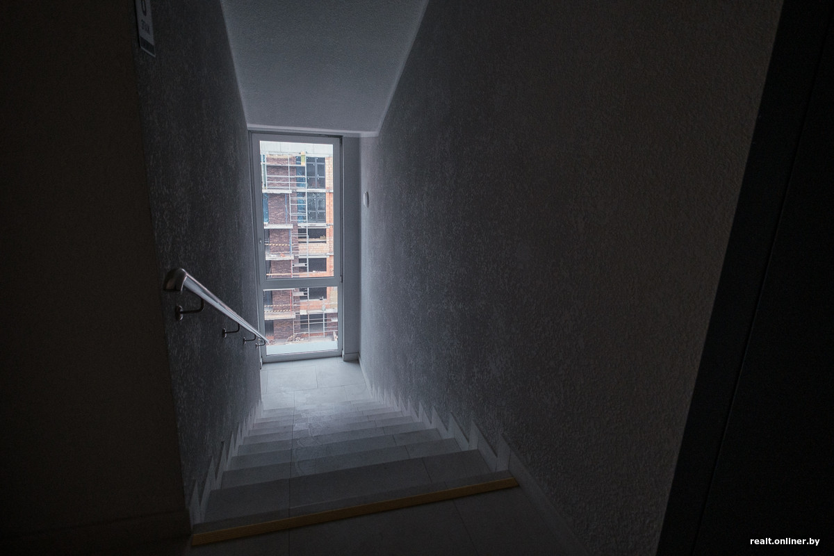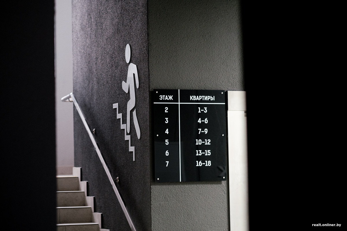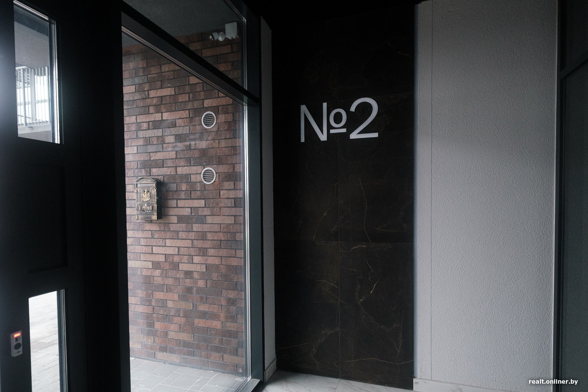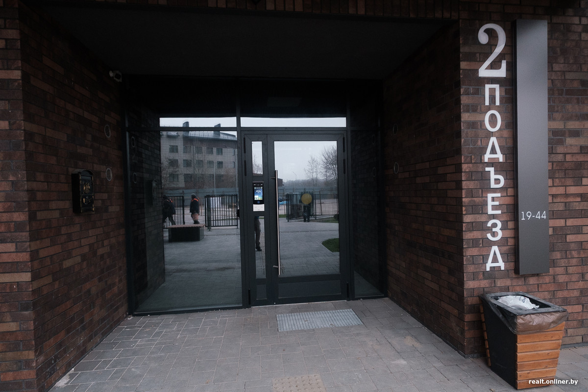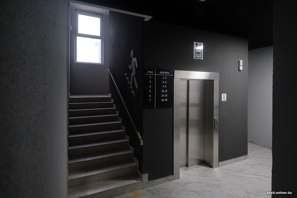 — Входная группа стеклянная, — начинает экскурсию Мирослав. — Для Минска это уже общепринятая практика, а в Бресте даже в новых домах зачастую ставят металлические двери. Стены в парадных отделаны керамической плиткой, предусмотрено вертикальное освещение, есть зеркала в пол.