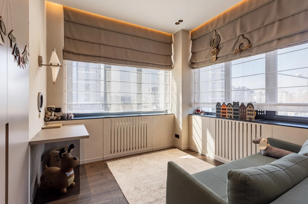 Общая площадь — 82,2 м², еще 5,7 м² занимает лоджия с оборудованной зоной отдыха. Высота потолков — 3 метра. Планировка без экспериментов, но продуманная: три изолированные комнаты — спальня, детская и кабинет — и просторная кухня-гостиная, которая становится центром квартиры.