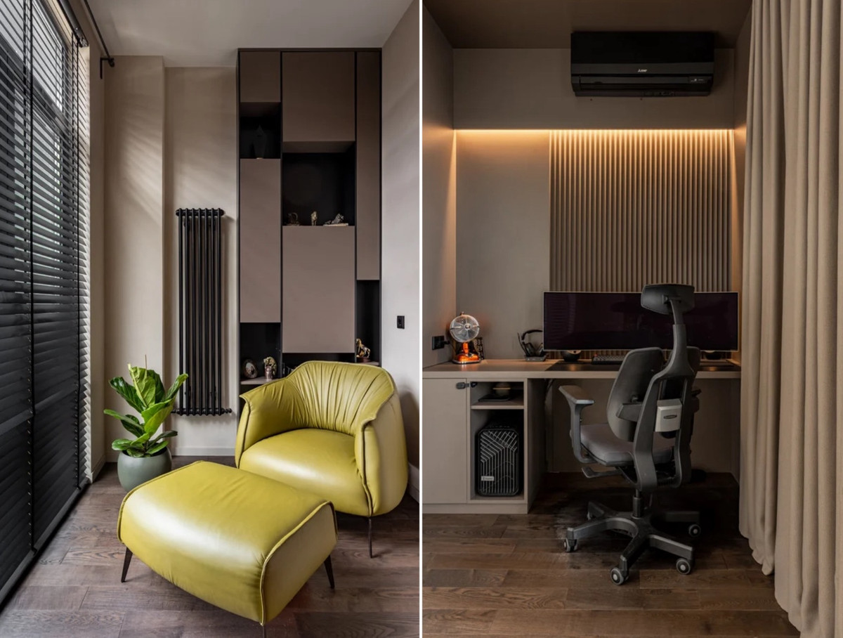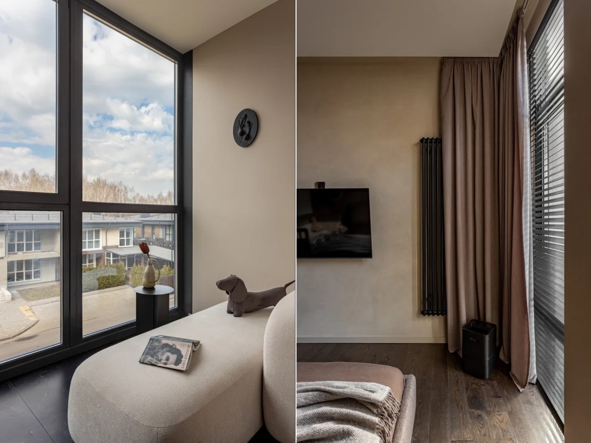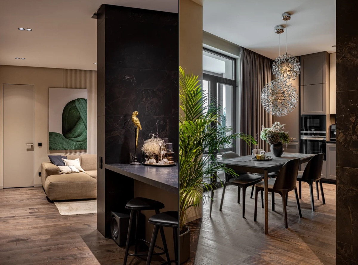 Интерьер выполнен в современном стиле — сдержанная палитра из черного, серого и бежевого цветов, без лишнего визуального шума. Пространство дополняют картины, скульптуры и дизайнерские светильники, которые не перетягивают внимание, а работают на общую атмосферу.