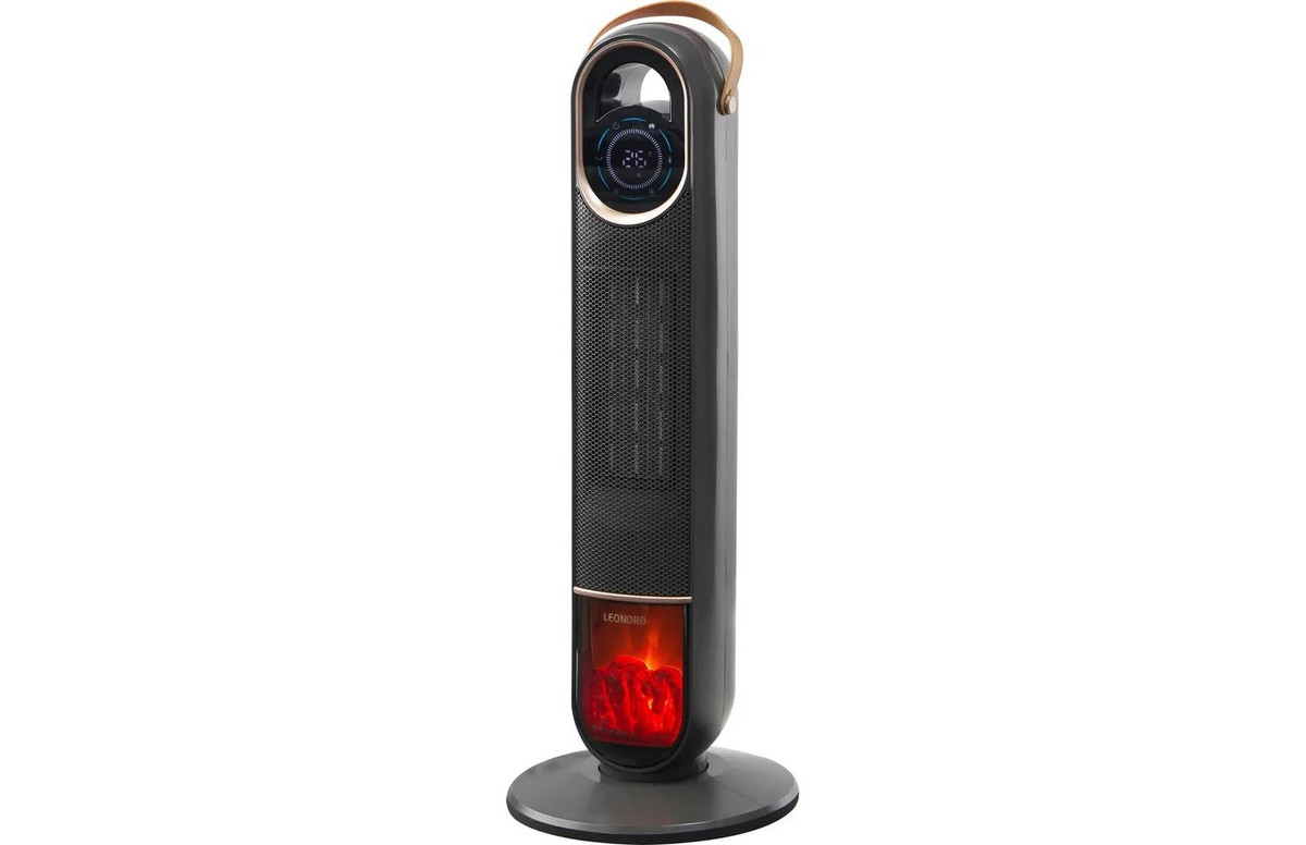 Leonord LPTC-6007K сразу выделяется внешне. Это черный керамический тепловентилятор с эффектом камина: в нижней части корпуса есть подсветка с имитацией огня. Выглядит необычно для обогревателя и создает атмосферу, особенно вечером при приглушенном освещении. Именно за сочетание обогрева и визуального эффекта эту модель часто и выбирают.