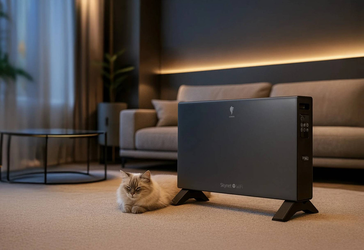Электрический конвектор мощностью 2000 Вт с возможностью управления со смартфона. Внешне он выглядит аккуратно и современно, а подключение по Wi-Fi делает настройку максимально гибкой: можно установить расписание — и прибор будет сам поддерживать климат.