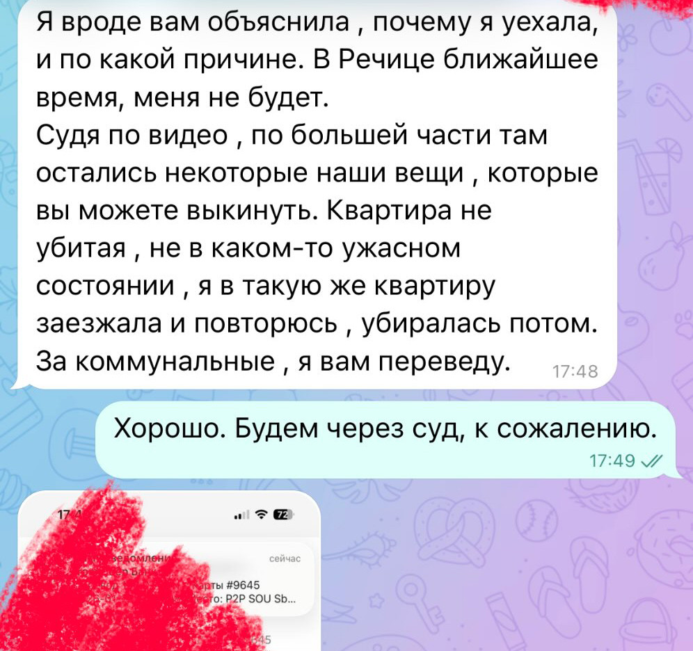 Пара заселилась. По словам девушки, с ними сложились максимально приятные взаимоотношения. Она попросила ребят заранее сообщить об их намерении съехать. Доверие было настолько сильным, что Анастасия вообще не заходила в свое имущество и получала деньги за аренду удаленно. Но однажды, в очередной день, когда сумма должна была поступить на карточку, она получила такое сообщение: