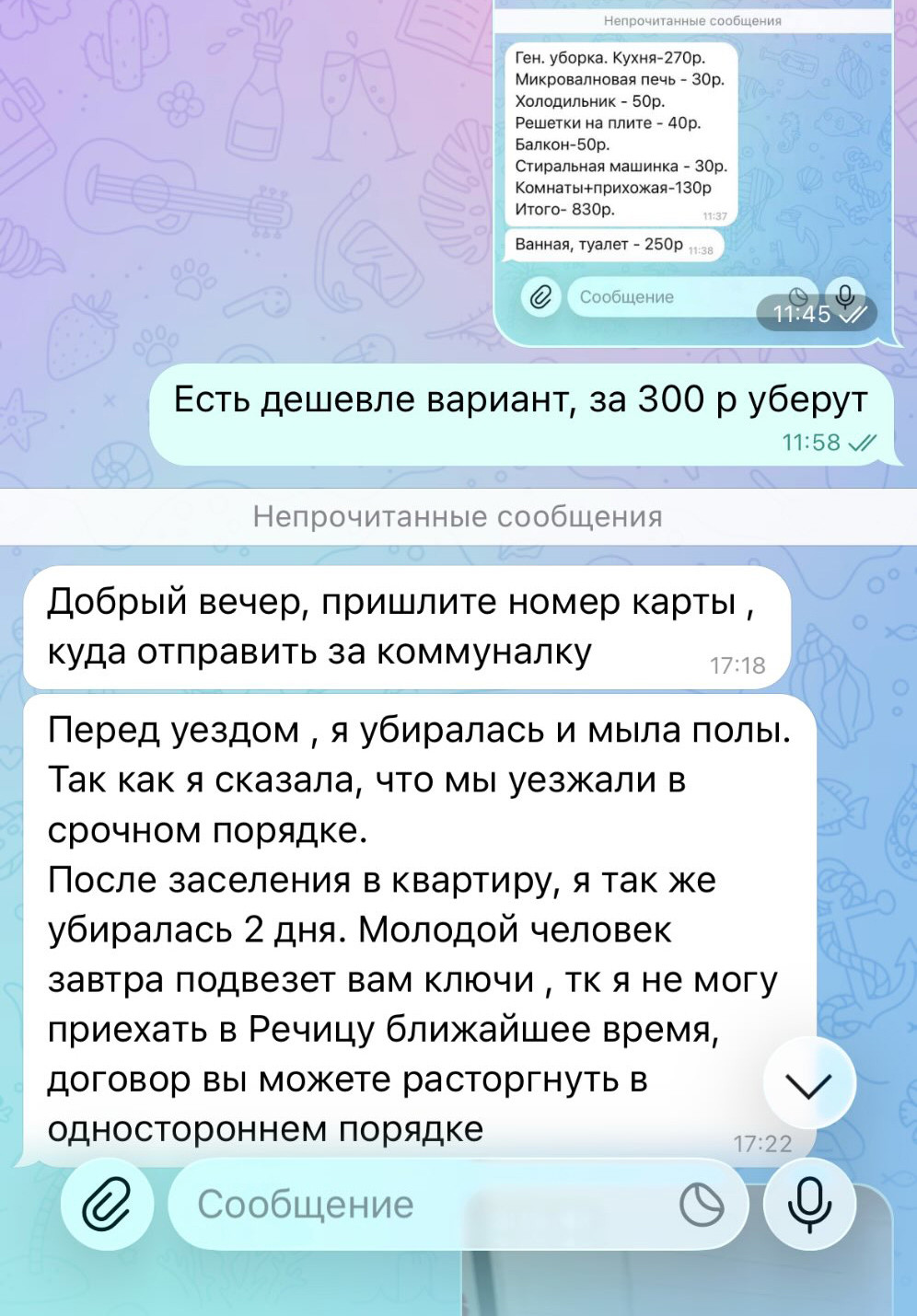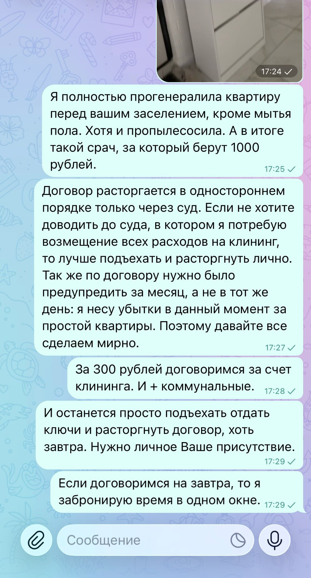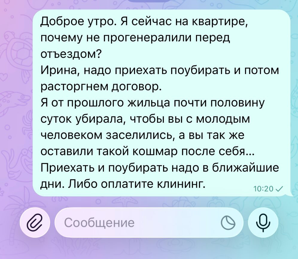 — В этот раз уже сама не убирала квартиру — отдала ее клинеру. Потому что нет ни сил, ни времени. Вечер, ключей до сих пор нет. А показ квартиры уже назначен. Звоню молодому человеку, он меня посылает далеко и надолго. Говорит, чтобы я обращалась к его девушке, так как он на работе. Объясняю ситуацию с их «уборкой» и говорю, чтобы возместили клининг. На это мне отвечает, что, когда они пришли смотреть квартиру, она была грязной, потом он выкинул белые носки. Сказал, что мою квартиру за такие деньги все равно никто не снимет и пускай я иду в суд, им все равно. Они прислали мне ключи через доставку. На этом и разошлись.
