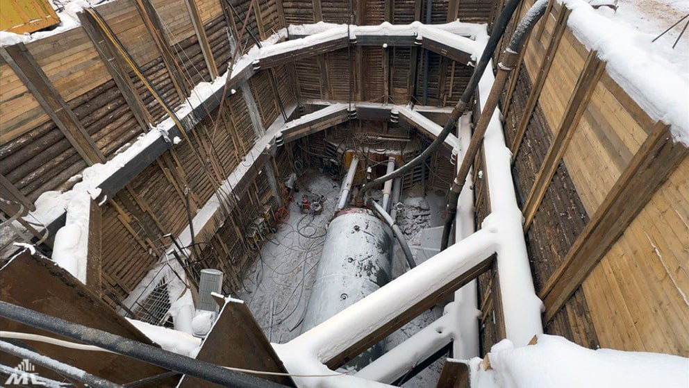 На поверхности устроен котлован с домкратной станцией, через которую тоннель «выдавливается», формируя железобетонные стенки. Грунт выводят наружу, отделяют и вывозят — поэтому на площадке задействована мощная техника, включая автокран грузоподъемностью 300 тонн.
