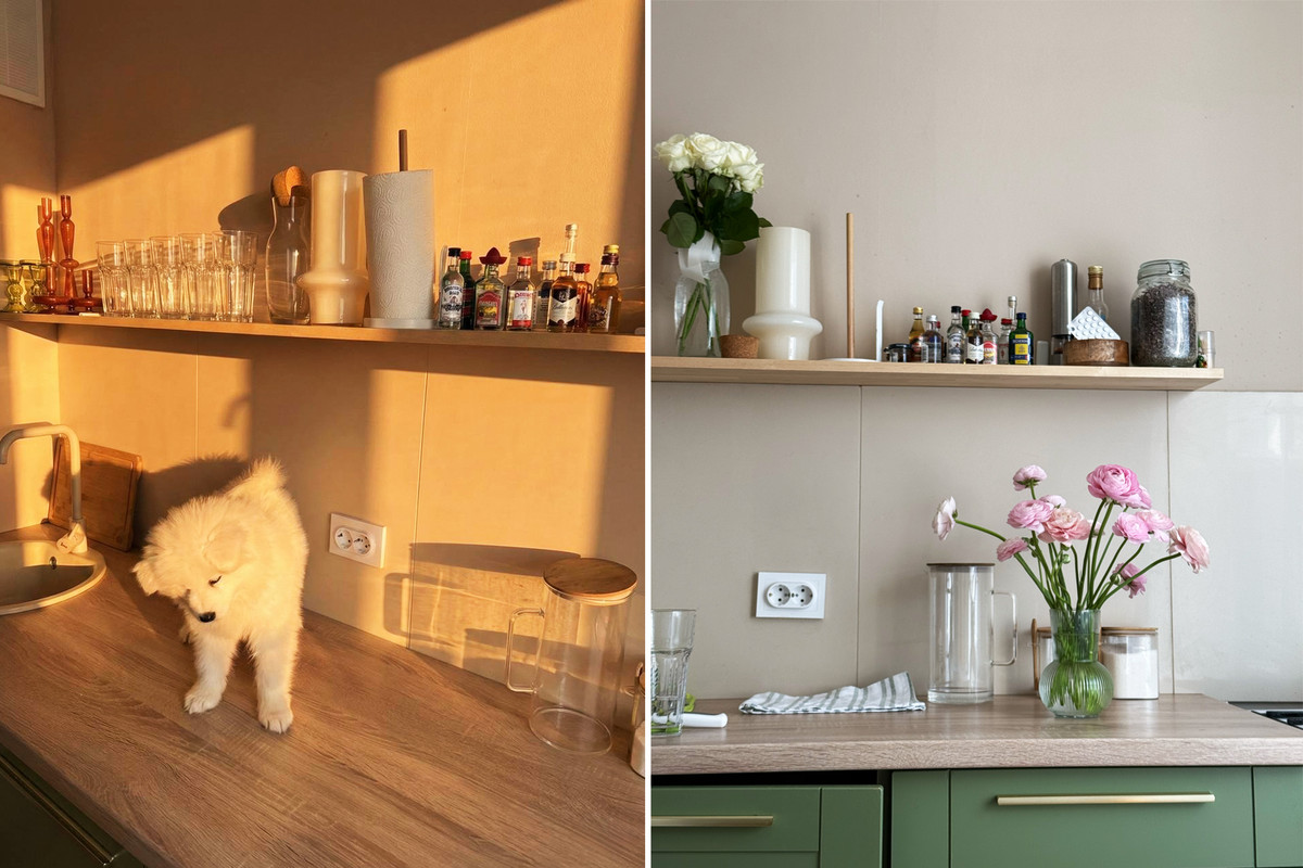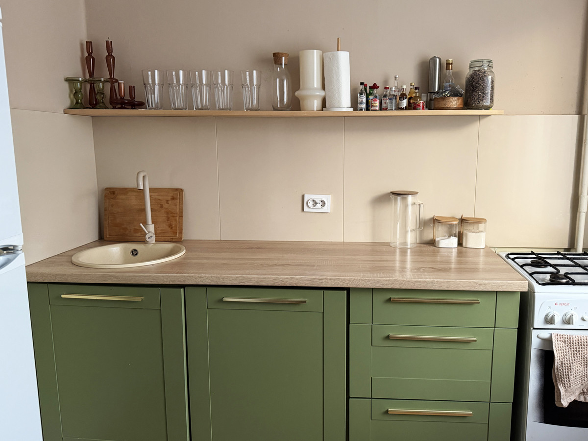 — На кухне поменяли обои, покрасили потолок, заменили столешницу, перекрасили фасады. Новую столешницу чудом нашли на сайте по перепродаже б/у вещей. Она обошлась всего в 100 рублей. При этом столешница была новой и идеально подошла по цвету. Через полчаса после публикации объявления мы уже ехали ее забирать. Раковина со смесителем стоила рублей 200. Для скинали использовали остатки старой плитки, лежавшей на даче. Сейчас модно делать открытую полку на кухне — ее мы купили. Теперь ставим на ней всякие красивые штуки, я любитель эстетичной посуды.