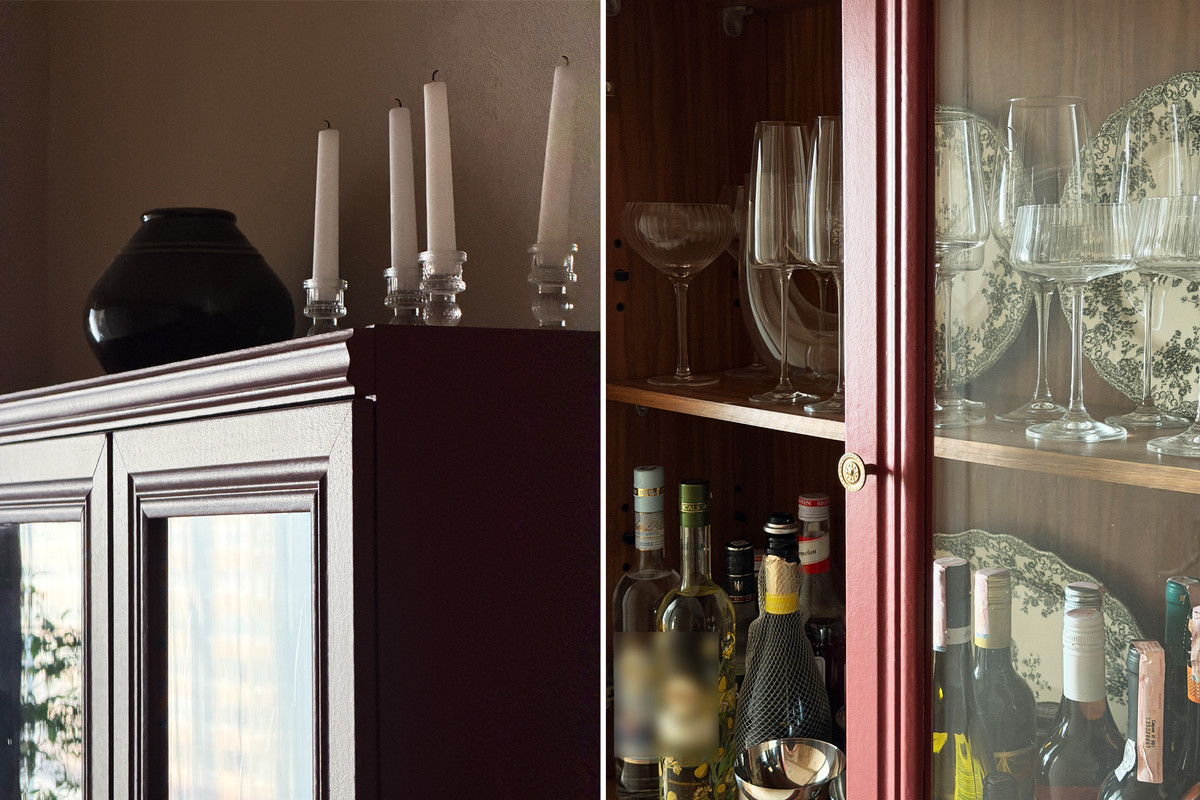 — Витрину вообще забрали бесплатно. Поставили ее на ножки, перекрасили в бордовый — она стала выглядеть как новая. Теперь в ней стоит красивая посуда и бутылки с алкоголем. Получился такой импровизированный бар.