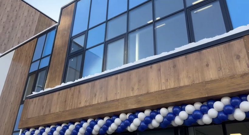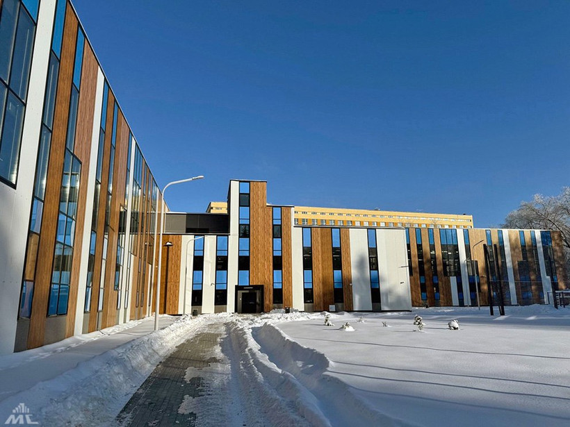 Пестрое здание, украшенное фасадами под дерево и стеклянными вставками, находится на улице Курчатова, в дубраве «Щомыслицкая».