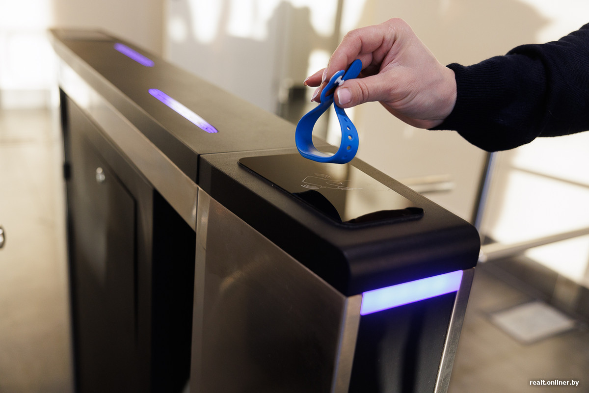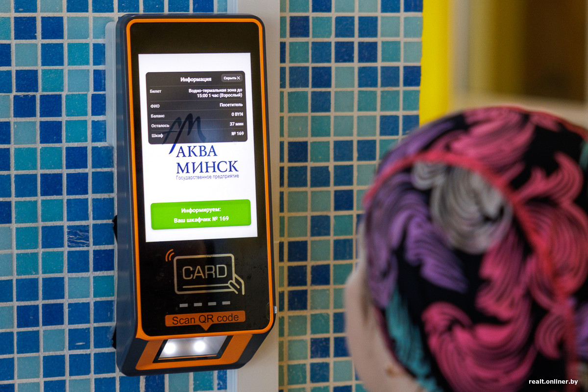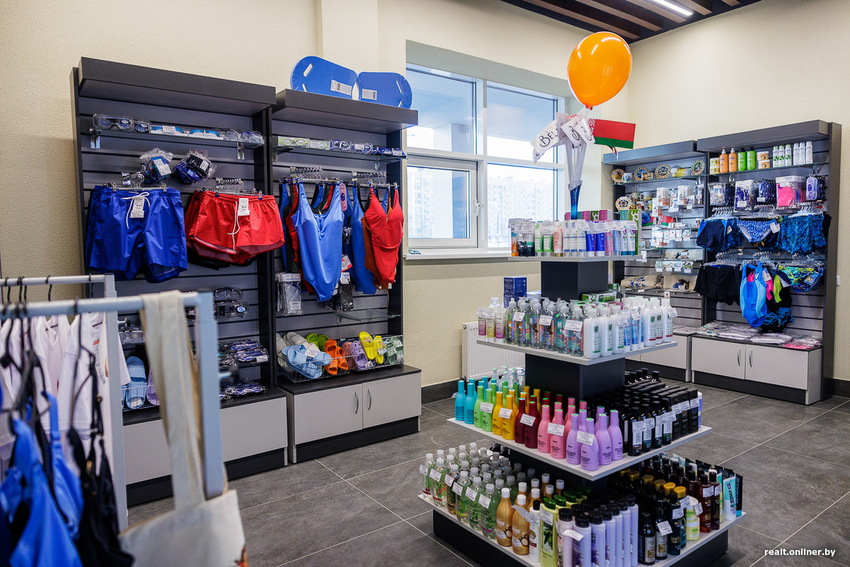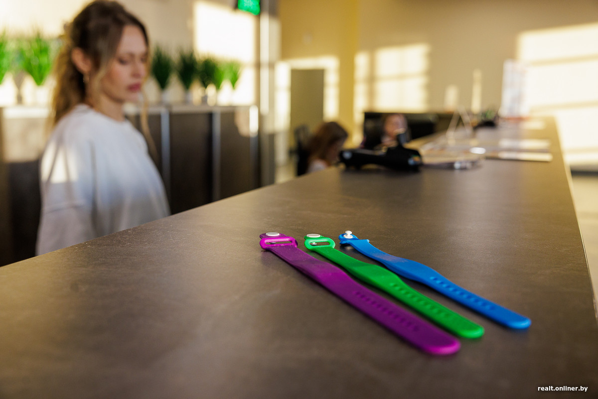 Вход в основное пространство осуществляется по браслетам. Голубой открывает доступ в аквазону, зеленый — в тренажерный зал, фиолетовый позволяет пользоваться обеими зонами. Рядом со стойкой регистрации работает магазин, где можно купить купальники, плавки, шапочки и средства для душа.