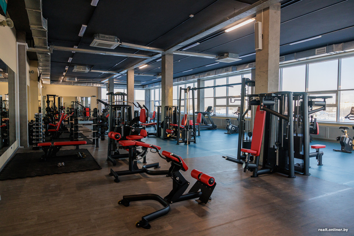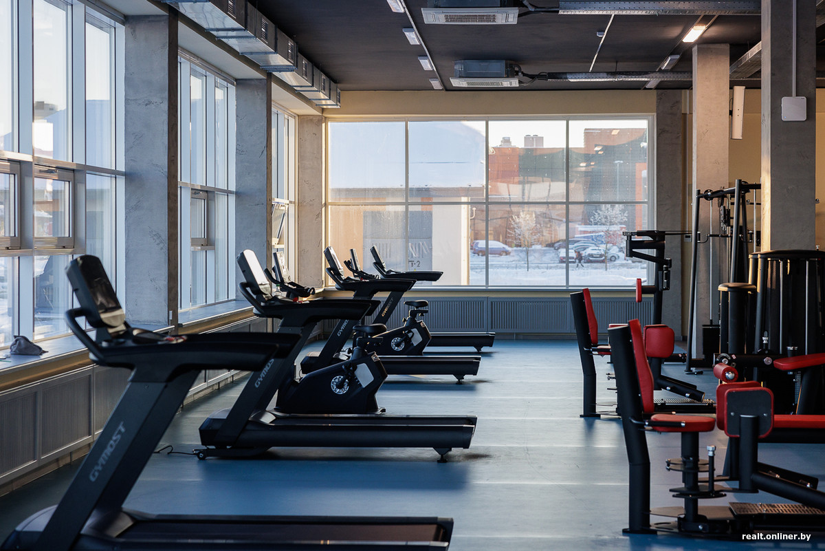 Тренажерный зал занимает около 360 квадратных метров. Здесь установлены 32 тренажера: от беговых дорожек до зоны свободных весов. В зале постоянно будет дежурить тренер. Для посетителей тренажерки не предусмотрено ограничений по времени пребывания — можно заниматься хоть весь день. Как и в аквазоне, здесь установлено панорамное остекление.