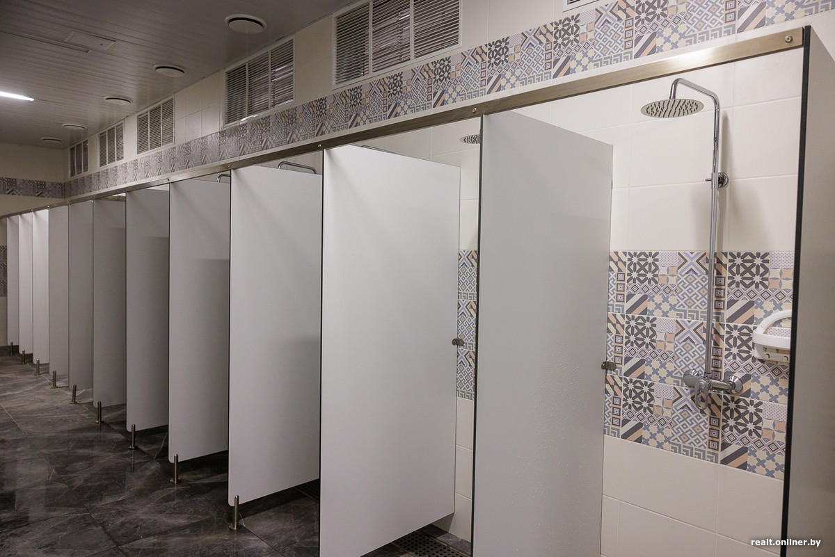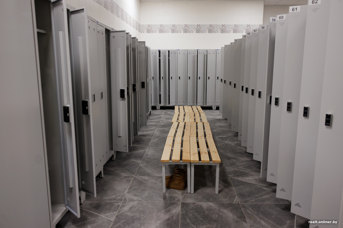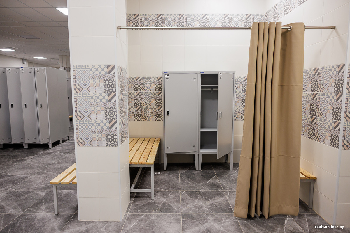 Раздевалки разделены на мужскую и женскую, в каждой — по 246 шкафчиков с электронными замками, скамейки, зеркала и фены. Оформлены они в нейтральной цветовой гамме. Для посетителей с детьми и людей с ограниченными возможностями предусмотрены отдельные раздевалки, которые можно закрыть шторкой. Далее — душевые и выход в аквазону. Санузлы расположены только в раздевалках, в самой аквазоне их нет.