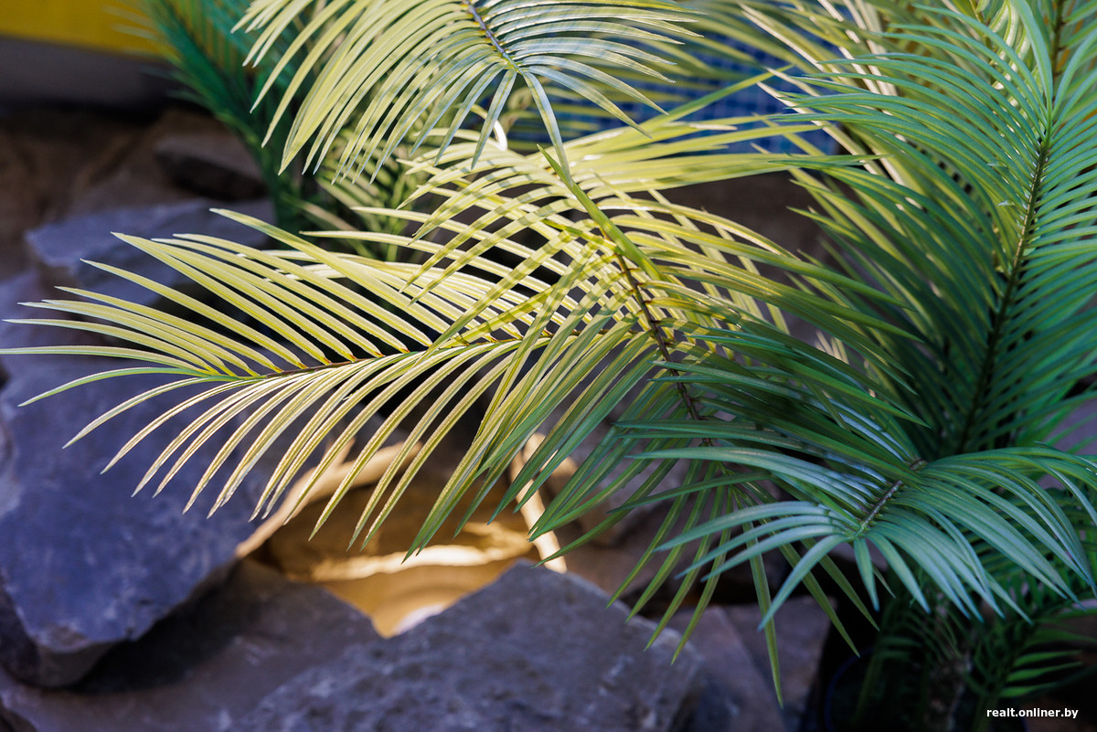 В целом здесь поддерживается тропическая атмосфера: повсюду искусственные пальмы, камешки, а сами бани напоминают бунгало с соломенными крышами.