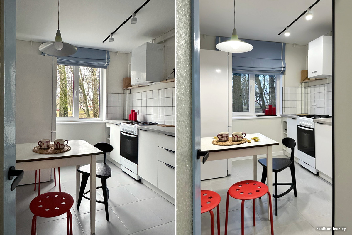 В кухне мы решили сохранить старую дверь с «родным» рифленым стеклом в цветочек. Хотелось сделать ее акцентной. Красный цвет показался слишком банальным, и после поиска референсов мы остановились на сочетании красного и голубого. Так полотно стало голубым. В поддержку цвета подобрали римскую штору, купленную на маркетплейсе во время «черной пятницы». Газовую трубу замаскировали зеркальным коробом, а красный смеситель с гибким изливом стал финальным ярким акцентом.