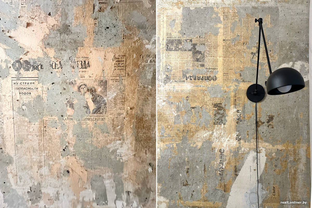 Во время демонтажа мы буквально сняли со стен культурные слои — за годы здесь сменилось семь поколений обоев. Самым нижним слоем оказались газеты «Правда», «Известия» и «Красная звезда» за 1968 год. В этот момент решение было принято окончательно: эту «стенгазету» мы оставляем и делаем акцентом в гостиной и коридоре. Уже в самом конце ремонта к нам заглянула соседка и, увидев стену, решила, что мы до сих пор не поклеили обои.