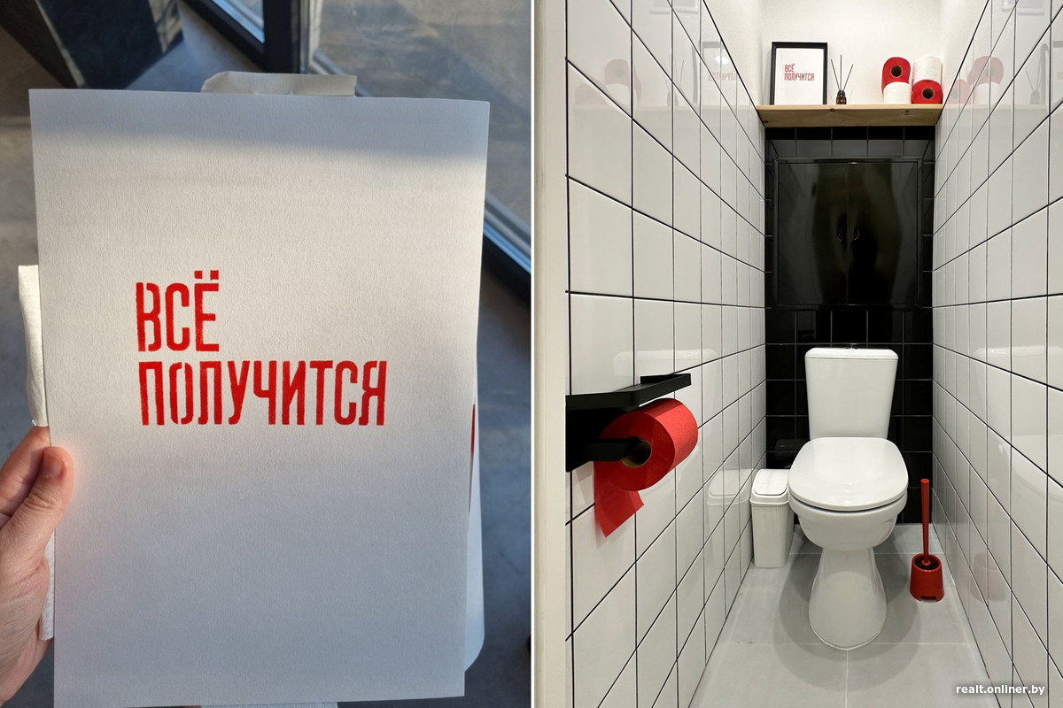 Ревизионный люк в туалете, доставшийся после капремонта дома, мы за 40 рублей покрасили порошковой краской в глянцевый черный цвет — он буквально растворился на фоне плитки. Добавили ироничный постер, сделанный своими руками, и полочку для телефона.