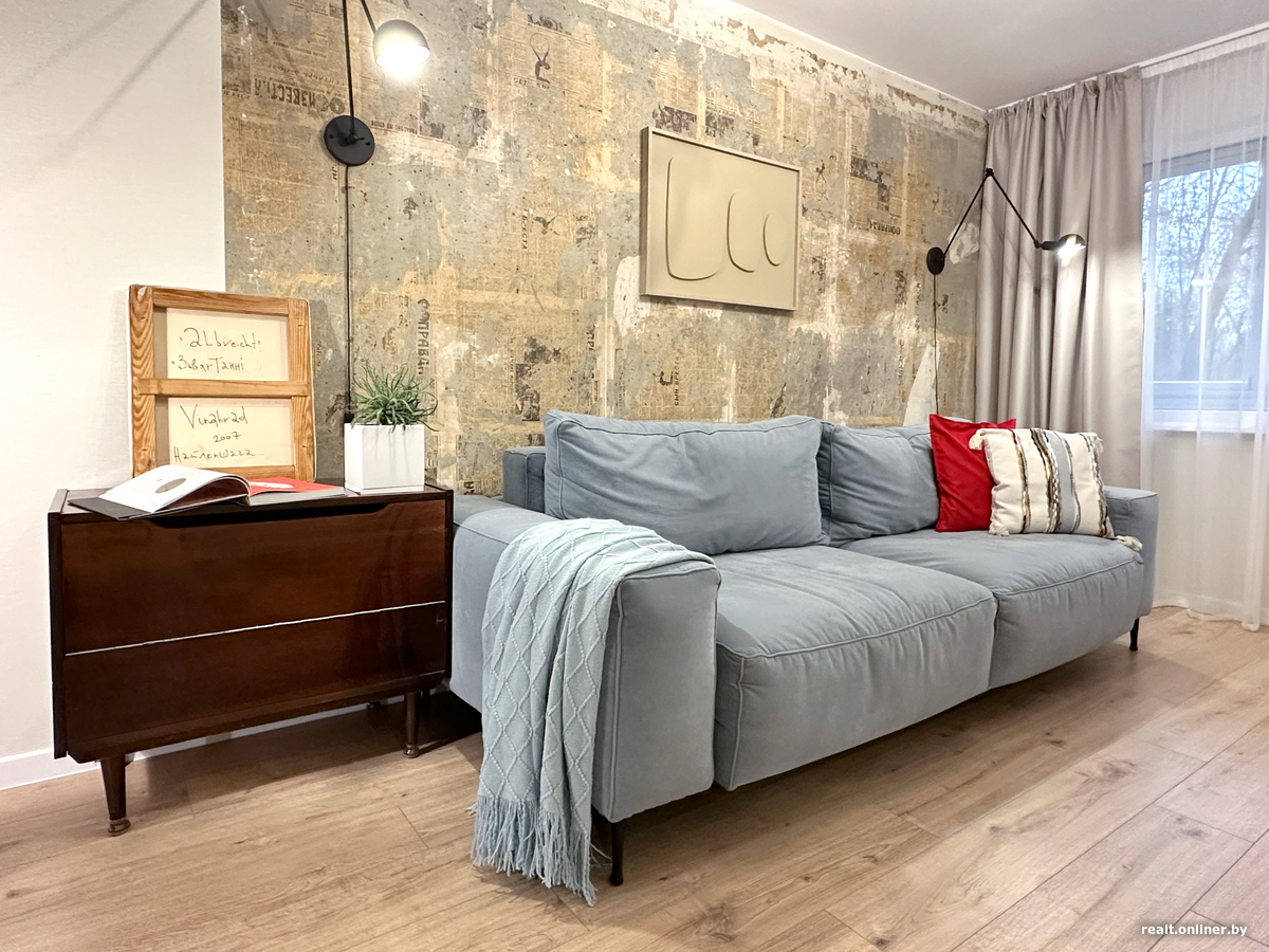 На фоне газетной стены поставили современный диван приглушенного голубого оттенка. Он стал центром притяжения квартиры, а поворотные бра позволили создать более камерный сценарий освещения.