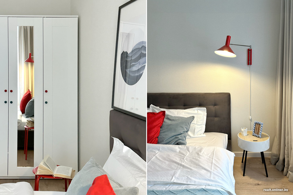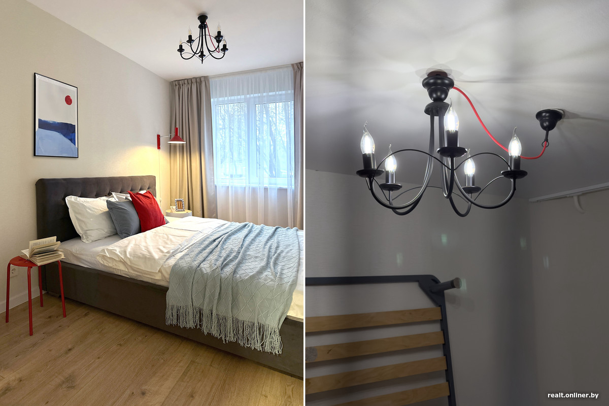 Спальня оказалась самой экономной частью ремонта. Мы купили недорогую б/у кровать, сделали химчистку и мелкий ремонт своими руками, заказали бюджетное бра, а шкаф нашли на маркетплейсе и просто заменили ручки. Потолочный светильник покрасили баллончиком и перенесли с помощью открытой проводки на красном текстильном проводе. Вся спальня обошлась в 1960 рублей.