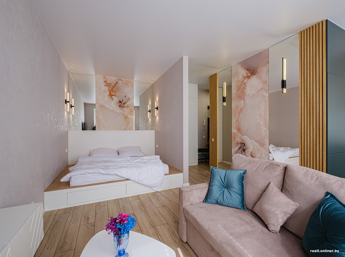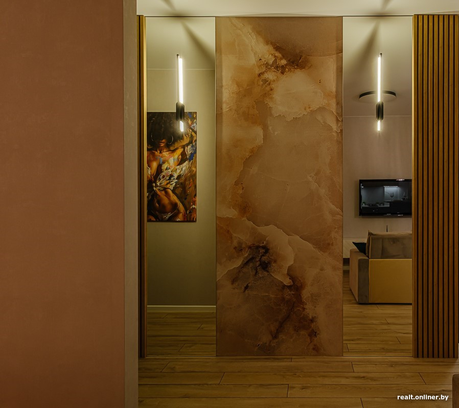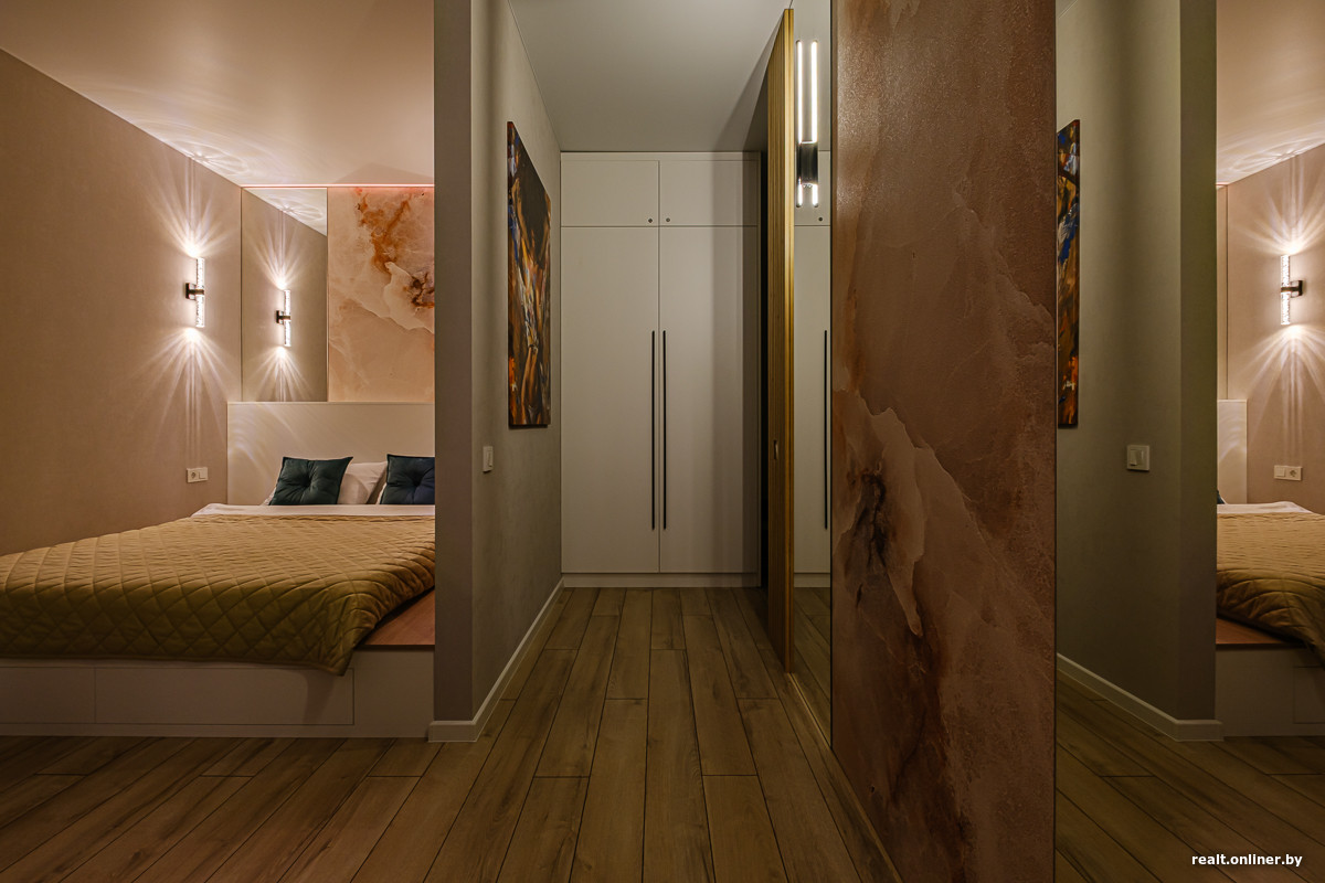 Еще одним акцентом стала декоративная стена с отделкой под мрамор и зеркалами в пол по бокам. Эта идея перекликается с оформлением изголовья кровати и задает общий тон интерьеру. Встроенные светильники создают уют и превращают стену в полноценную селфи-зону.