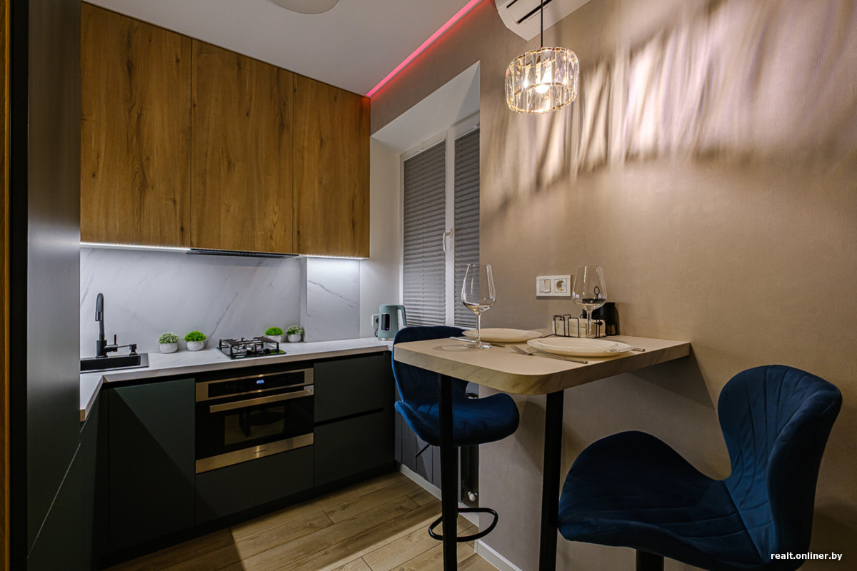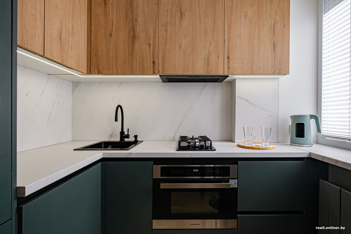 При небольшом метраже было важно использовать каждый сантиметр площади. Поэтому на кухне вместо громоздкой техники появились компактные встроенные духовка с функцией СВЧ, холодильник и посудомоечная машина.