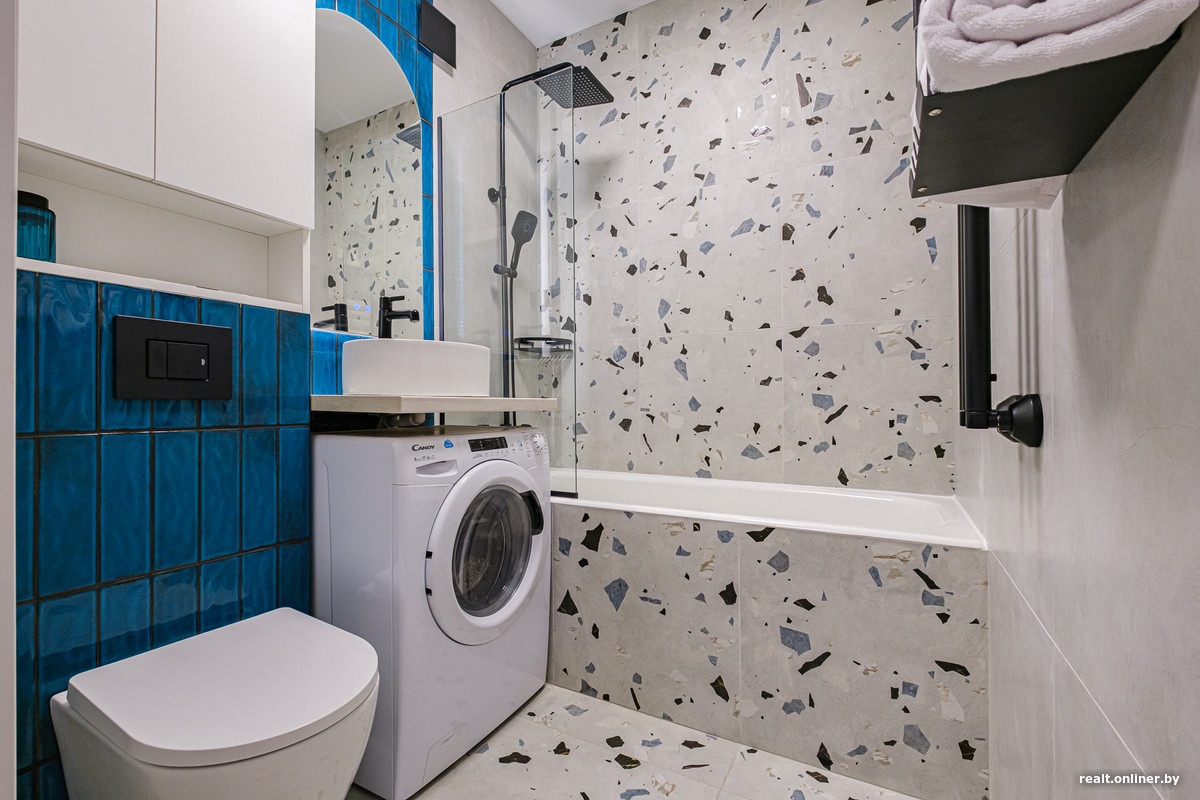 В санузле — ванна длиной 170 сантиметров, стирально-сушильная машина и инсталляция с вместительным шкафчиком над ней. Мест для хранения в квартире получилось много: шкаф в прихожей, ниши в диване, тумба под телевизором и даже пространство под матрасом кровати.