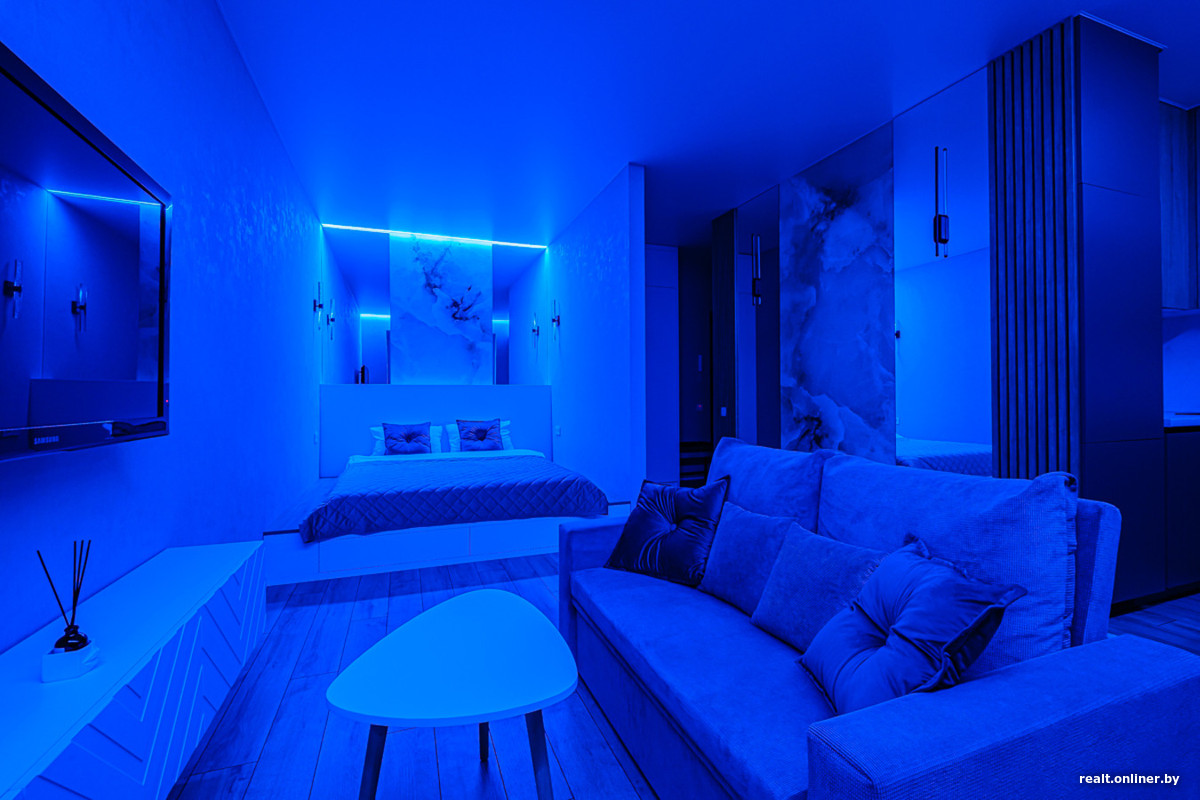 По периметру потолка я решила сделать многоцветную RGB-подсветку. Строители пытались отговорить меня, ссылаясь на сложность монтажа и дополнительные расходы, но я настояла и ни разу не пожалела. В темное время суток такое освещение задает особое настроение и делает квартиру более живой и романтичной.