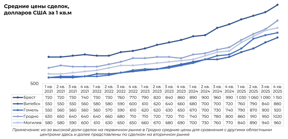 Специалисты также сравнили цены на квартиры в областных центрах. Самый дорогой квадратный метр — в Бресте, а наиболее доступный (на 30% ниже) — в Витебске. За год больше, чем в других городах, цены выросли в Гродно (+28%), меньше — в Бресте (+16%).