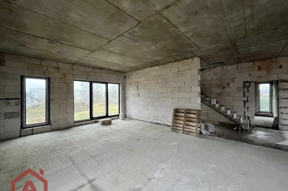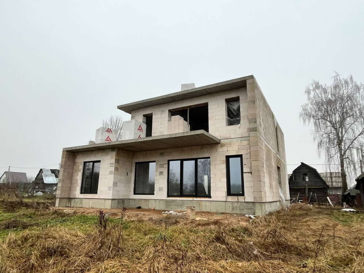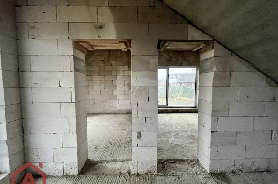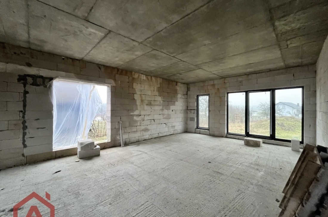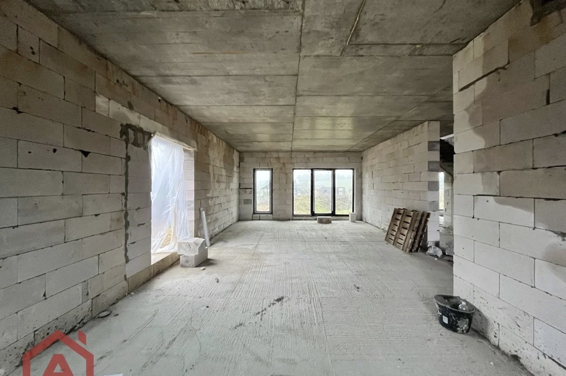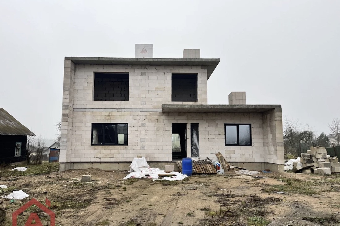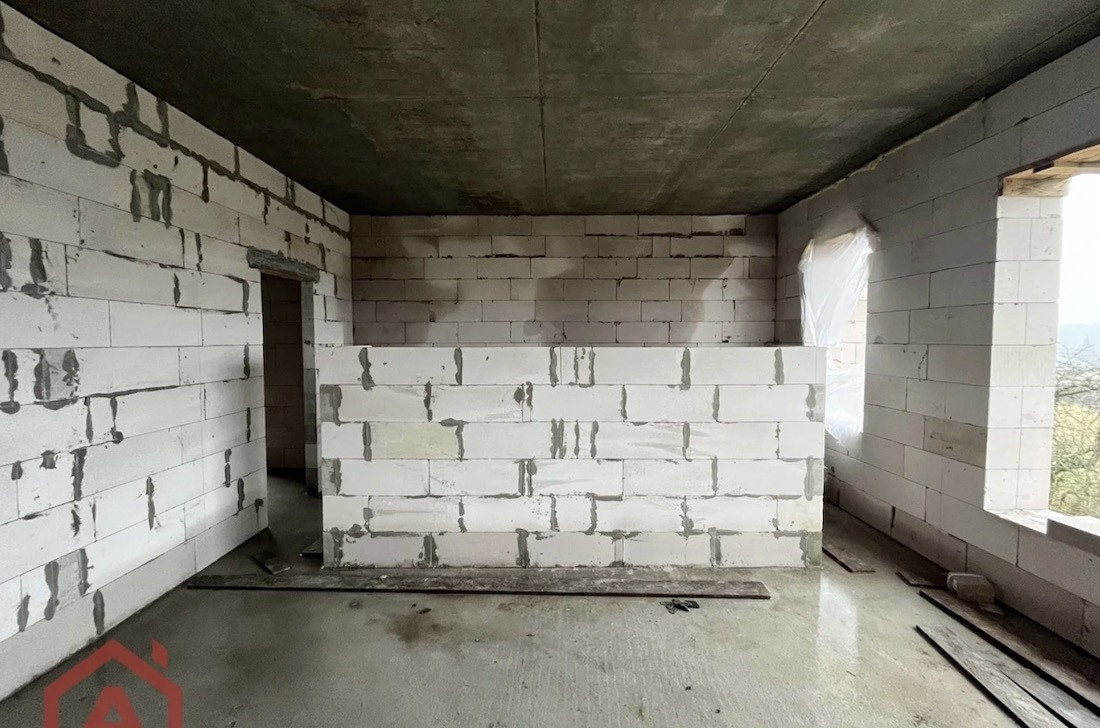 Дом, который нужно довести до ума, имеет солидную площадь — 225 «квадратов». Постройка строгой лаконичной формы, уже частично остеклена. Предполагается, что общий метраж можно разделить на просторную (более 60 метров) кухню-столовую, пять жилых комнат, два санузла и вспомогательные помещения. Предусмотрены и терраса с балконом, с которых открывается красивый вид.