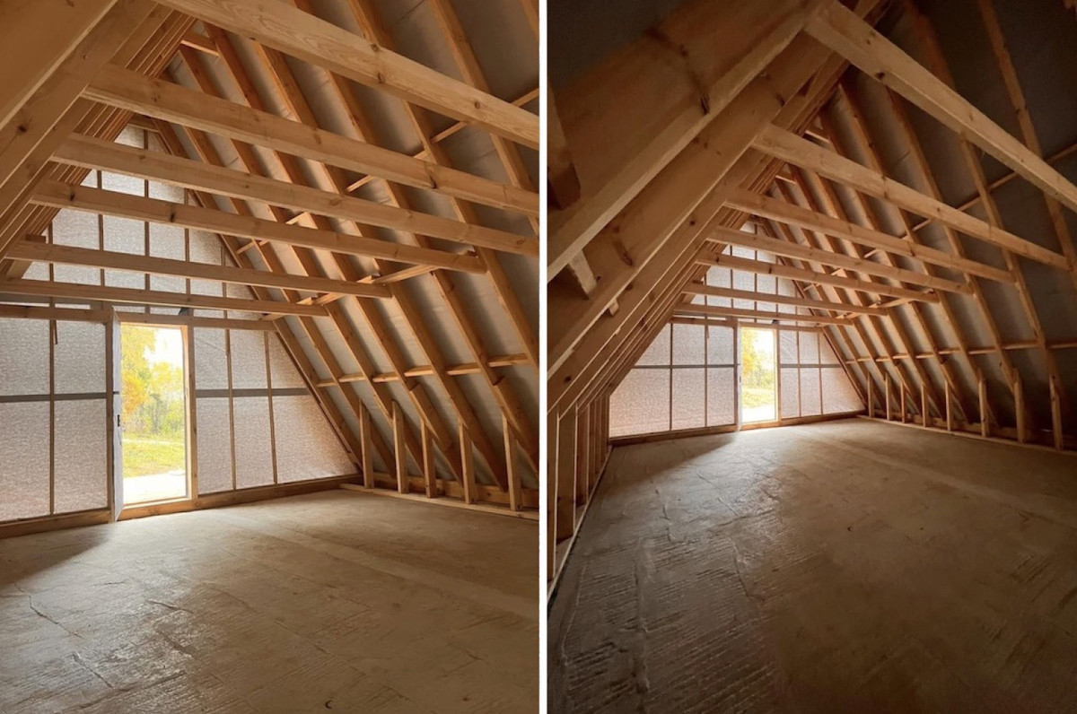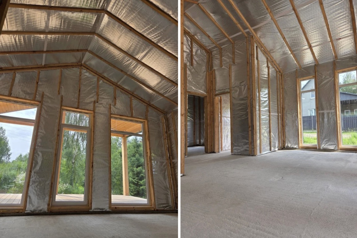 По фото впечатления от дома только положительные (одни потолки высотой 4,5 метра чего стоят!). «Стены — деревянный каркас с утеплением (каменная вата), закрыты пароизоляционной пленкой и мембраной. Пол — черновая стяжка. Фундамент — свайно-ростверковый. Крыша — металлопрофиль, установлена водосточная система и снегоудержатель. Водоснабжение — скважина глубиной 90 метров.