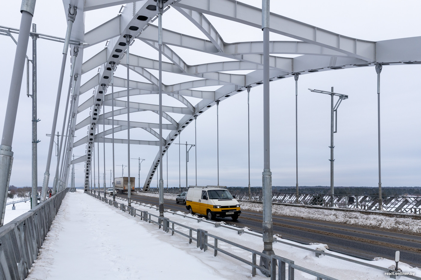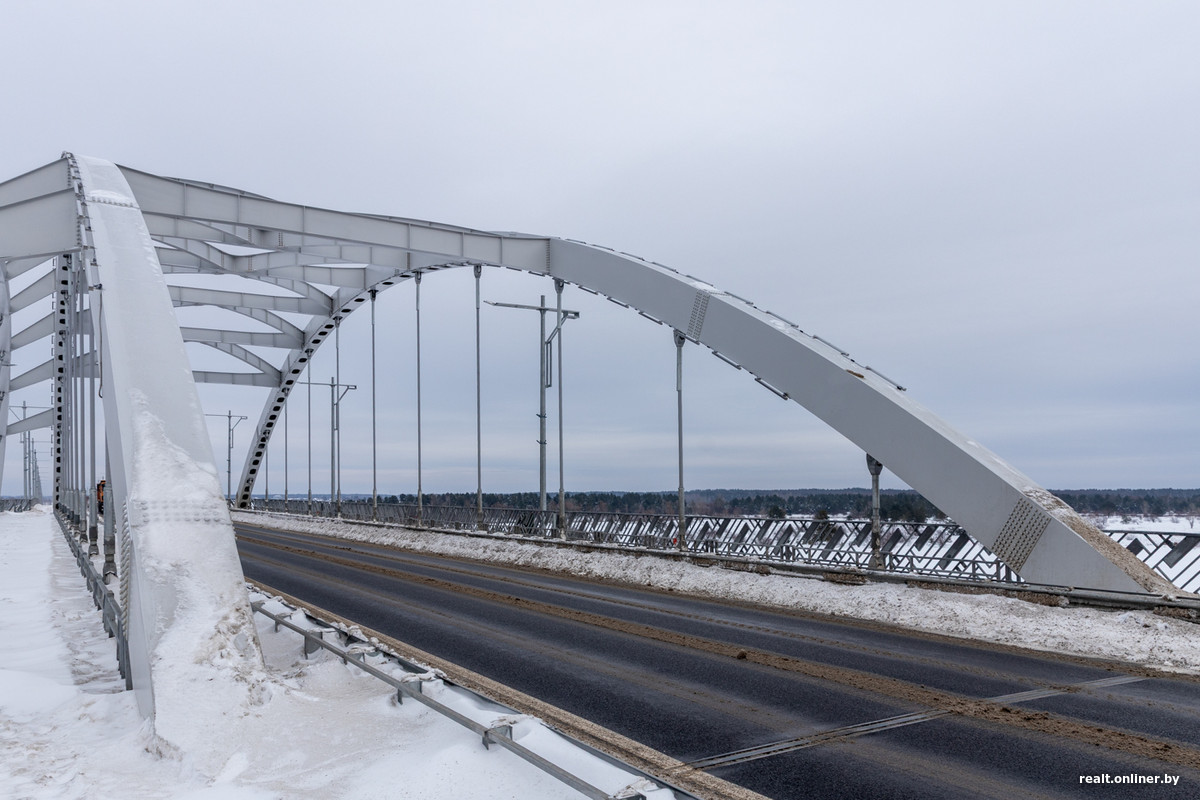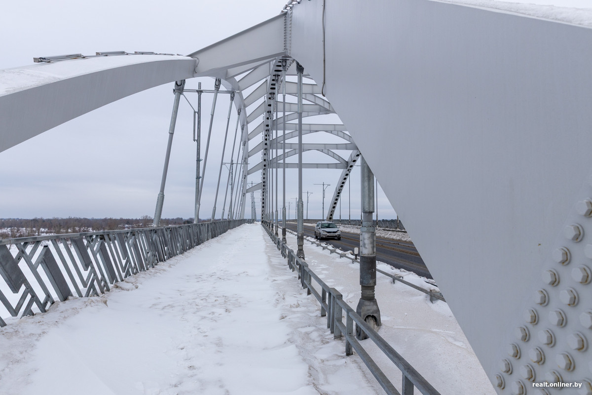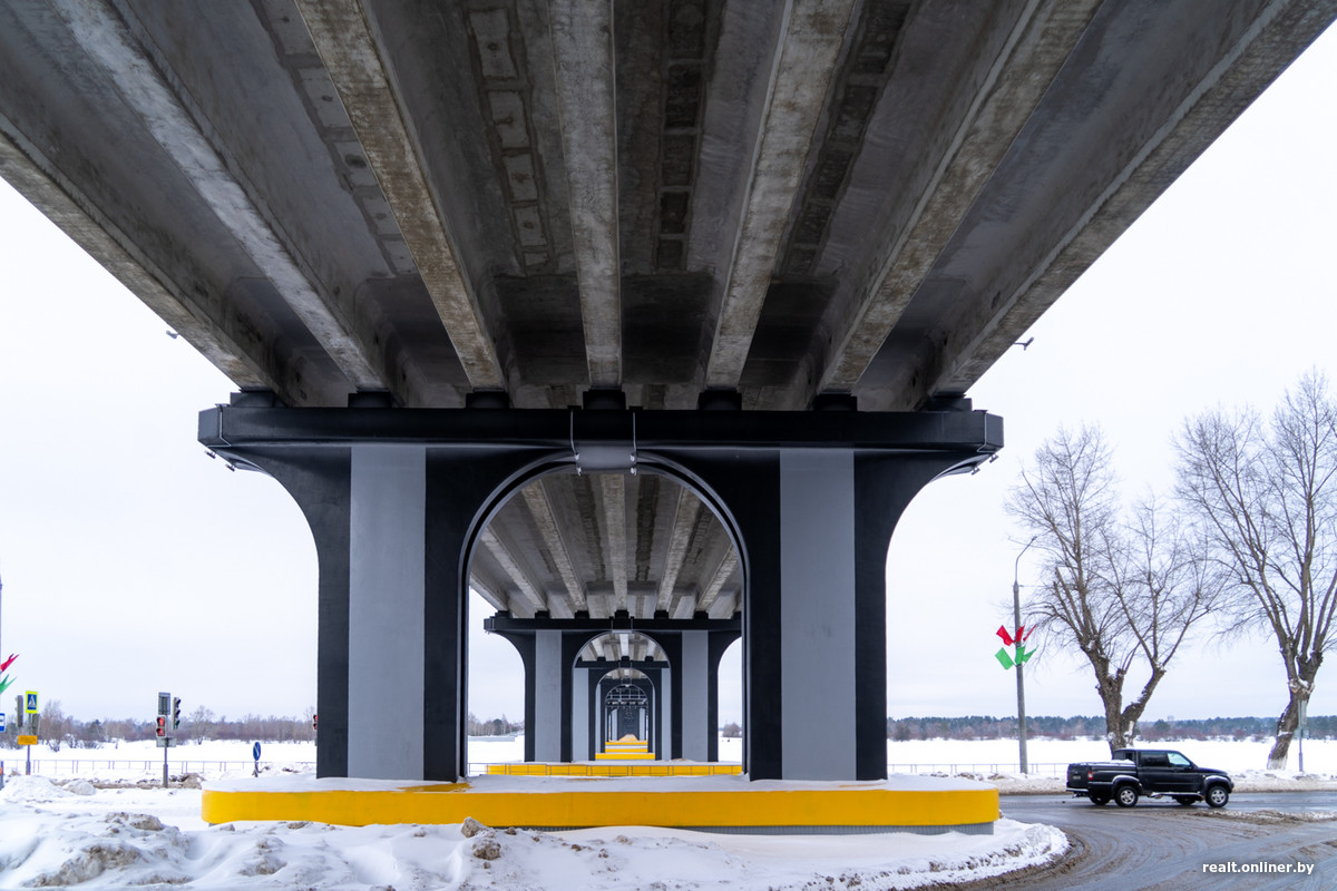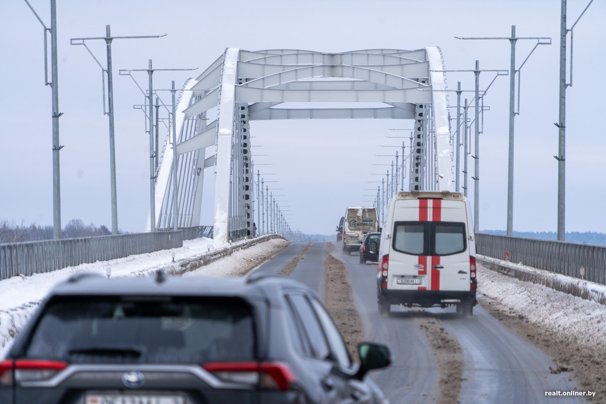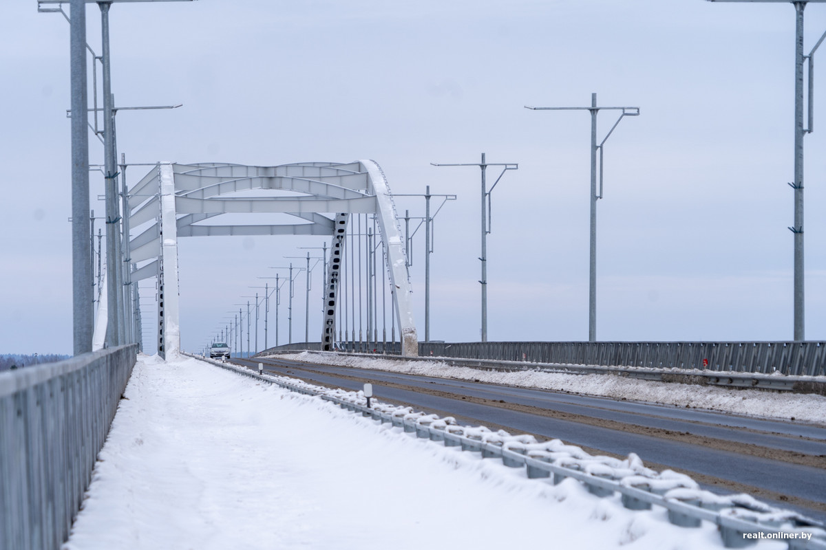А вот несколько фактов, чтобы еще больше вас впечатлить. Длина нового моста — 909,03 метра, что делает его вторым по величине автомобильным мостом в стране. (К слову, «старший брат» расположен неподалеку, на дороге Р31 Бобруйск — Мозырь, и имеет длину 948 метров).