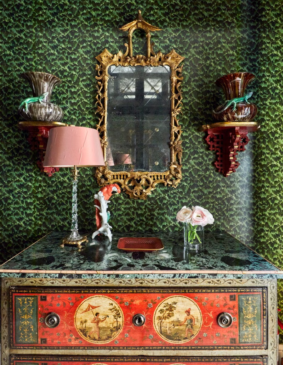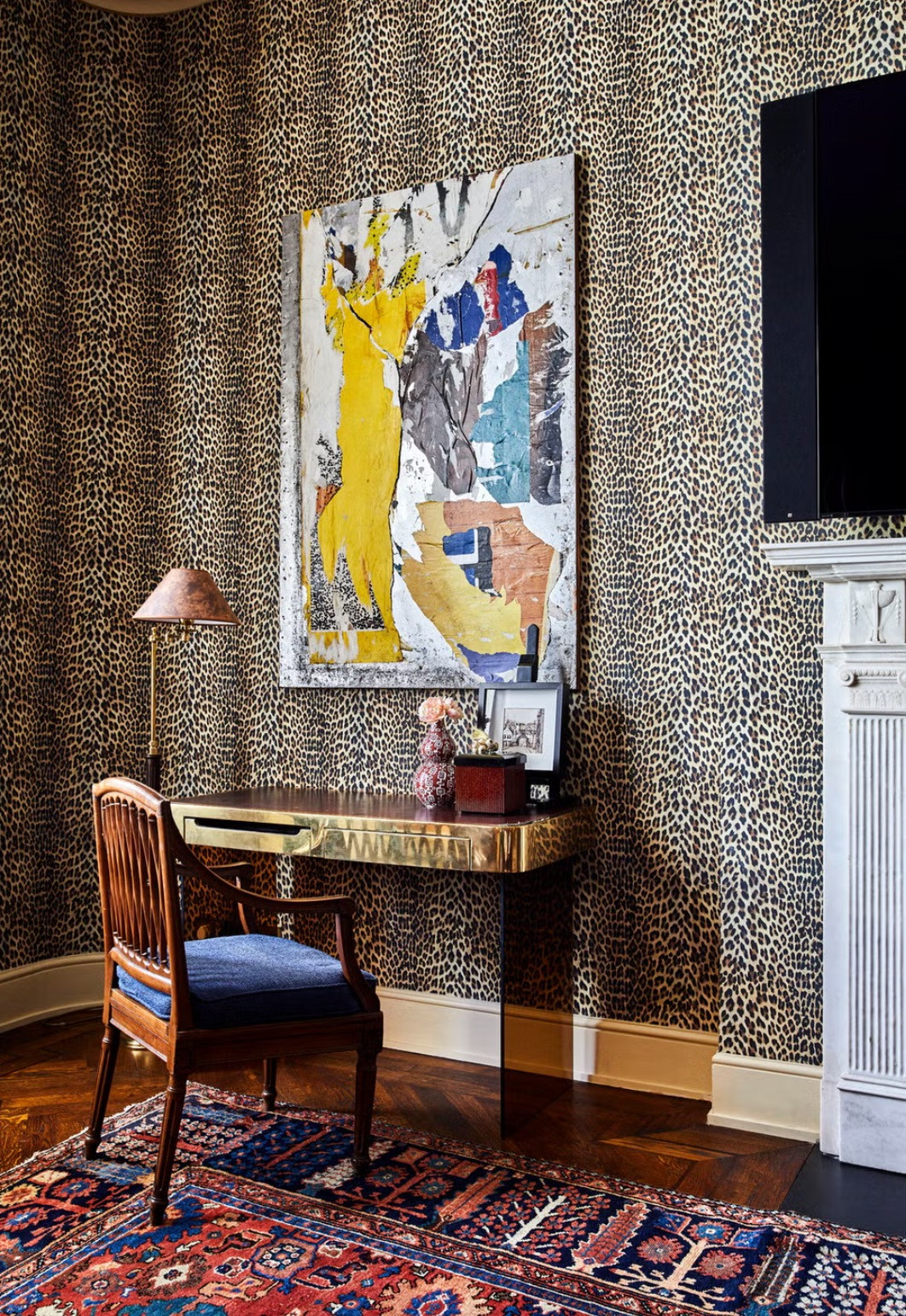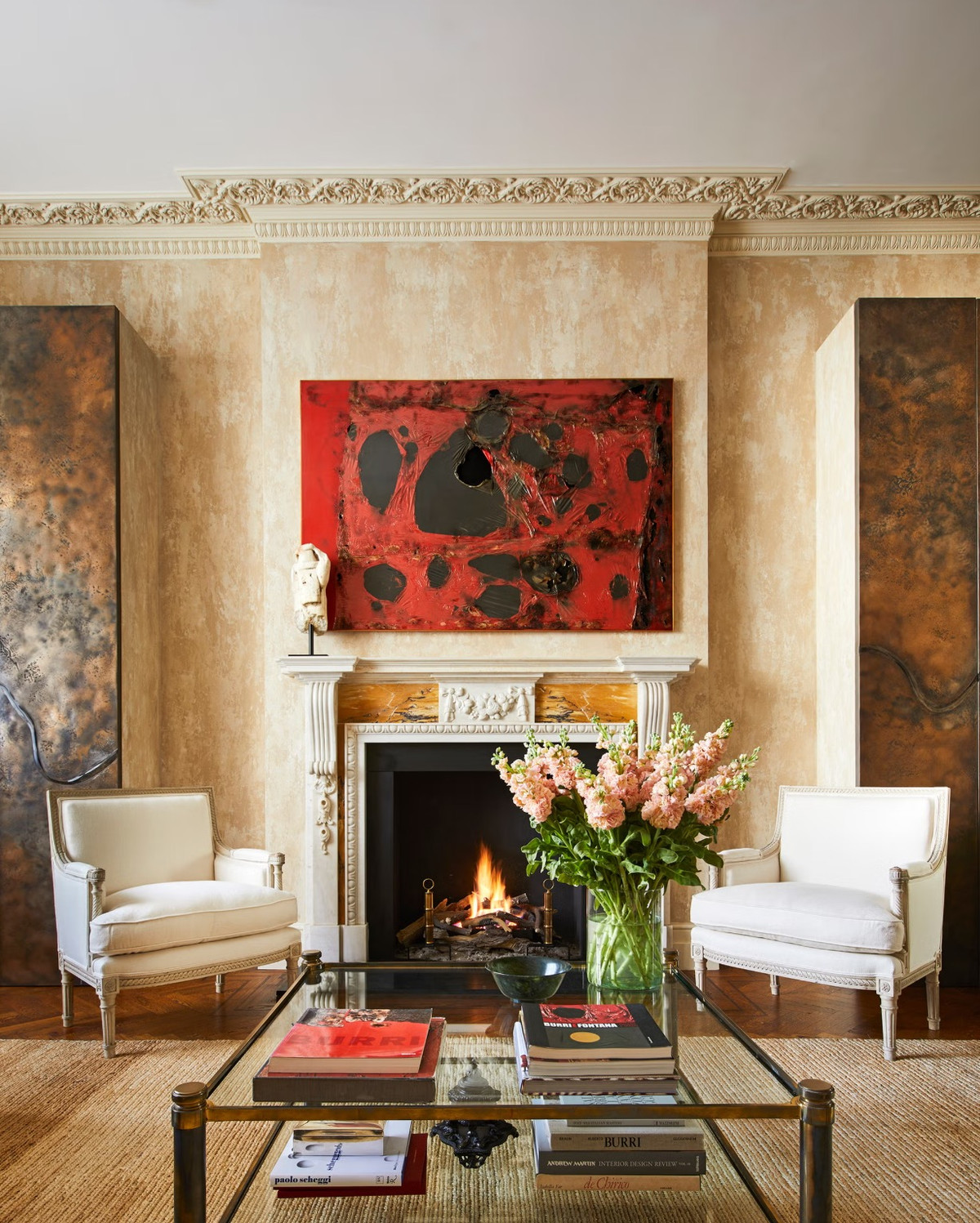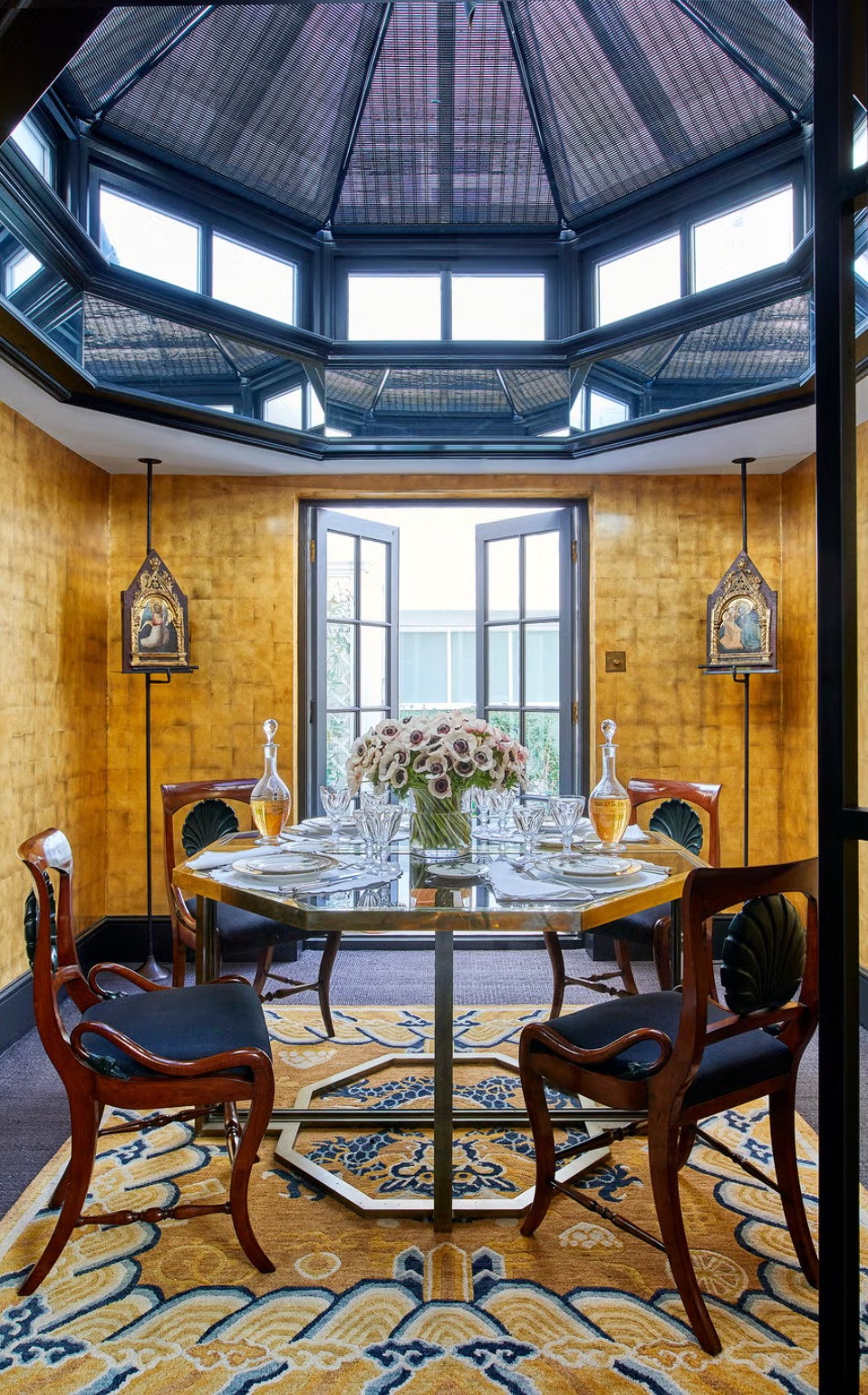Гостиная сочетает спокойные нейтральные тона с золотыми акцентами и современными картинами, а библиотека поражает смешением персидских ковров, леопардовых обоев и антикварной мебели. Каждая комната имеет какие-то отличительные черты: столовая с винтажным фарфором и абстрактными картинами, кухня с красными шкафами и деревянными полами с геометрическим узором.