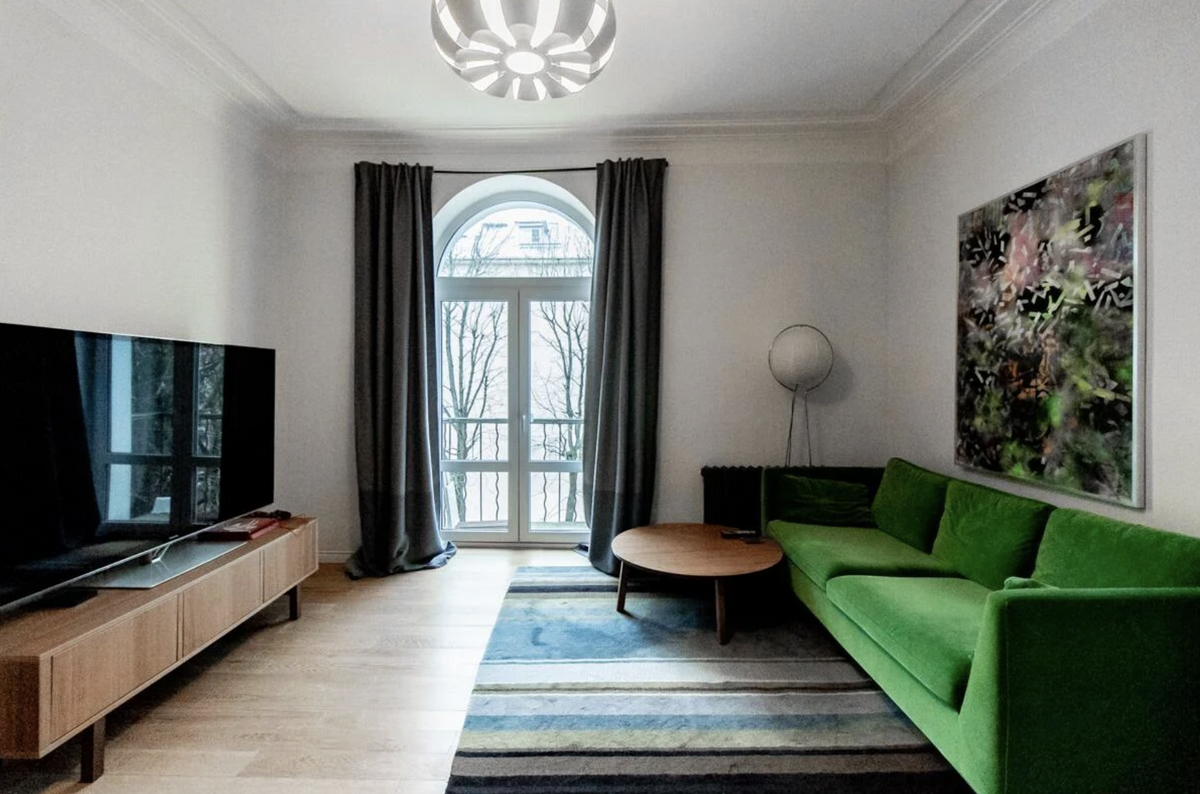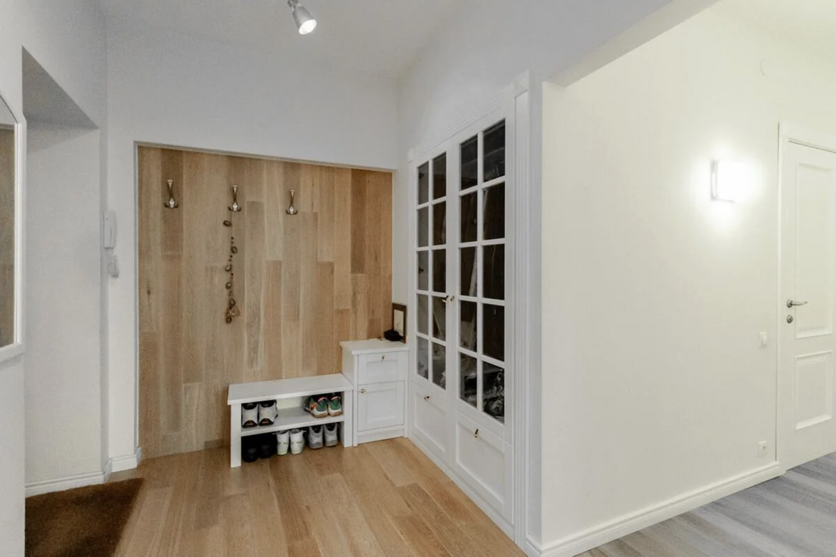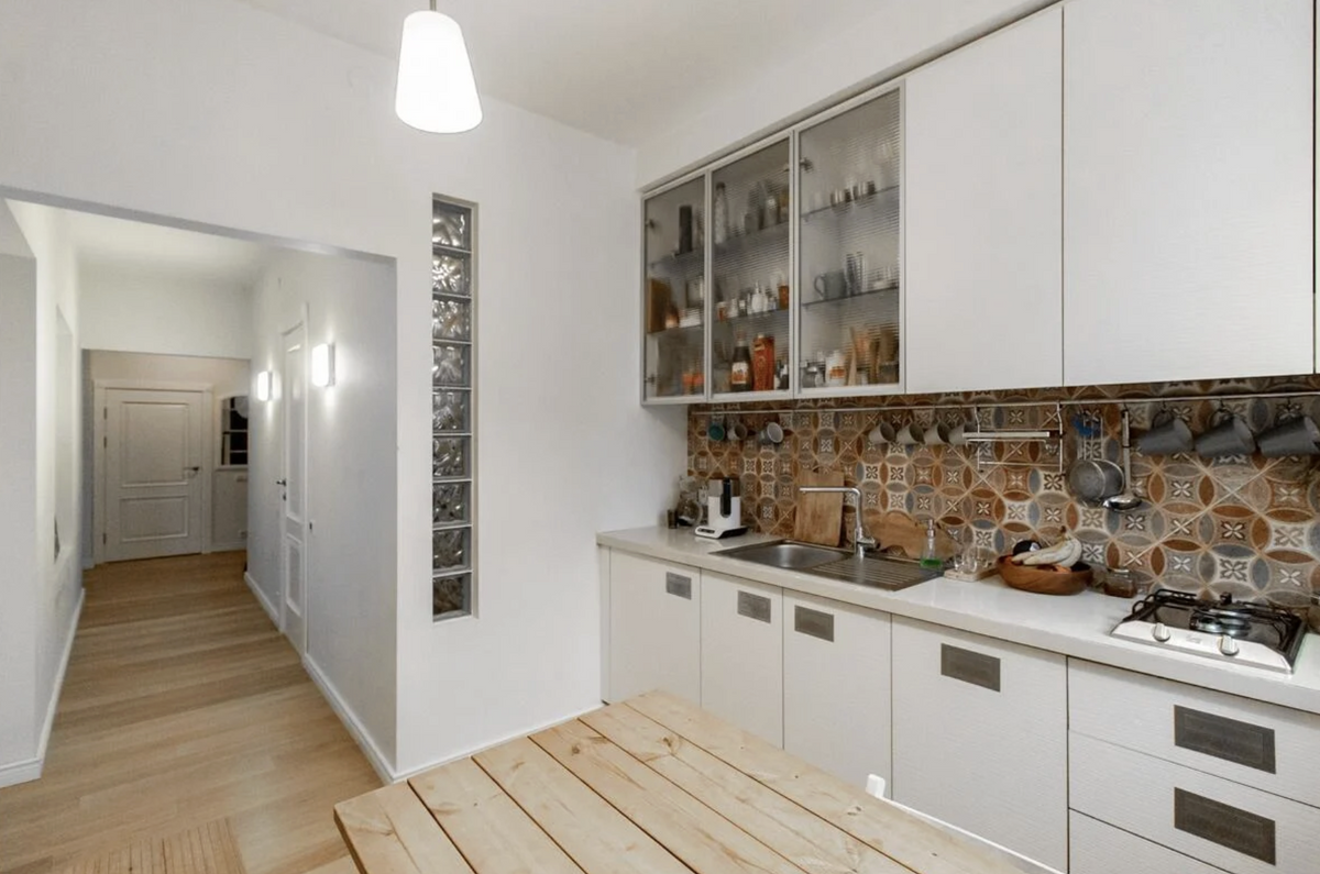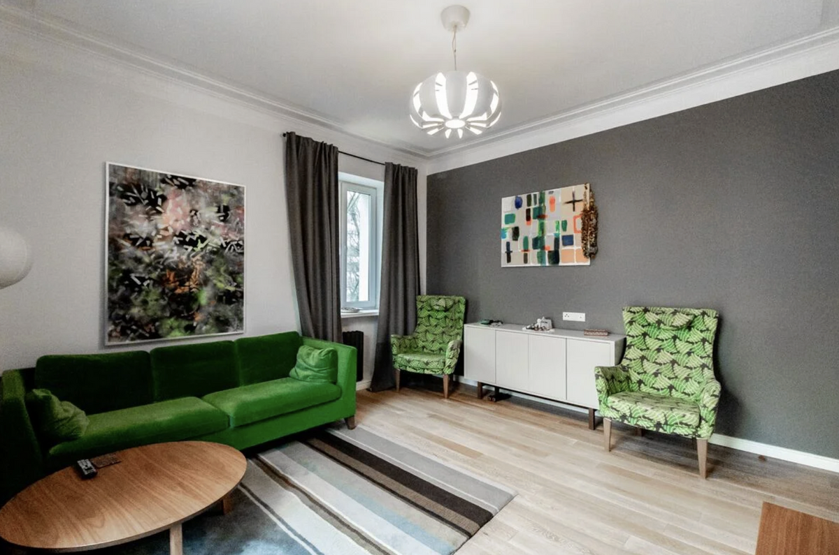 Трехметровые потолки, широкие коридоры и просторные комнаты — в таких условиях минималистичный ремонт с яркими акцентами смотрится очень фотогенично.