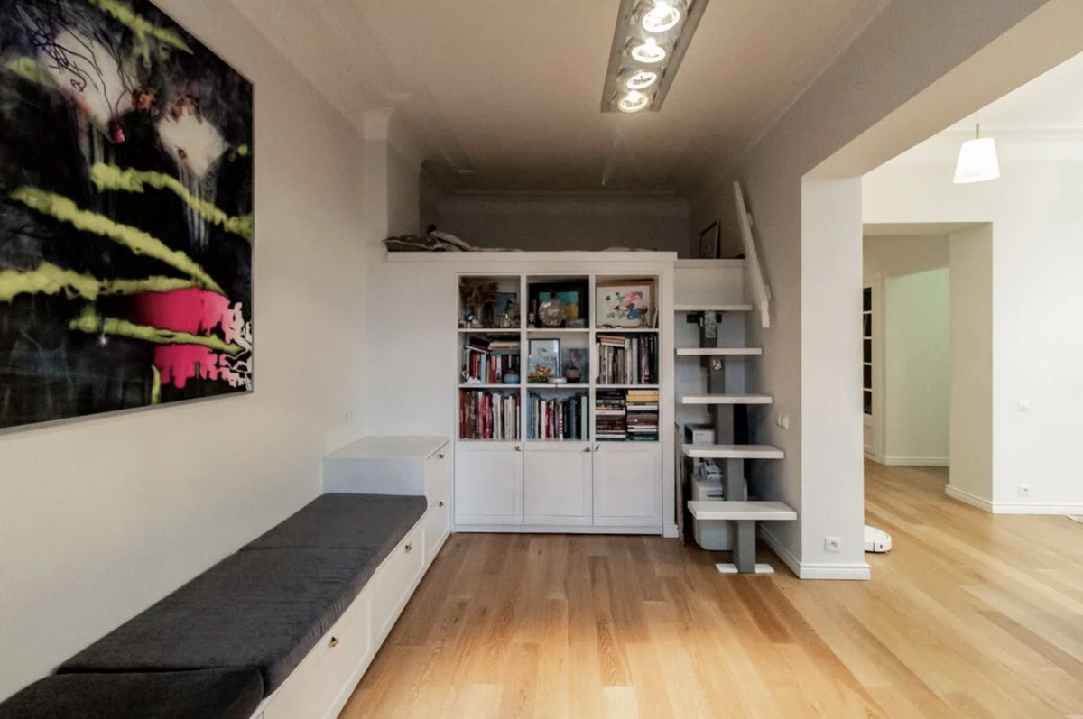 Эффектная трешка располагается в кирпичной трехэтажке 1950 года постройки. Рядом — река, велодорожка, тропинки и много зелени.