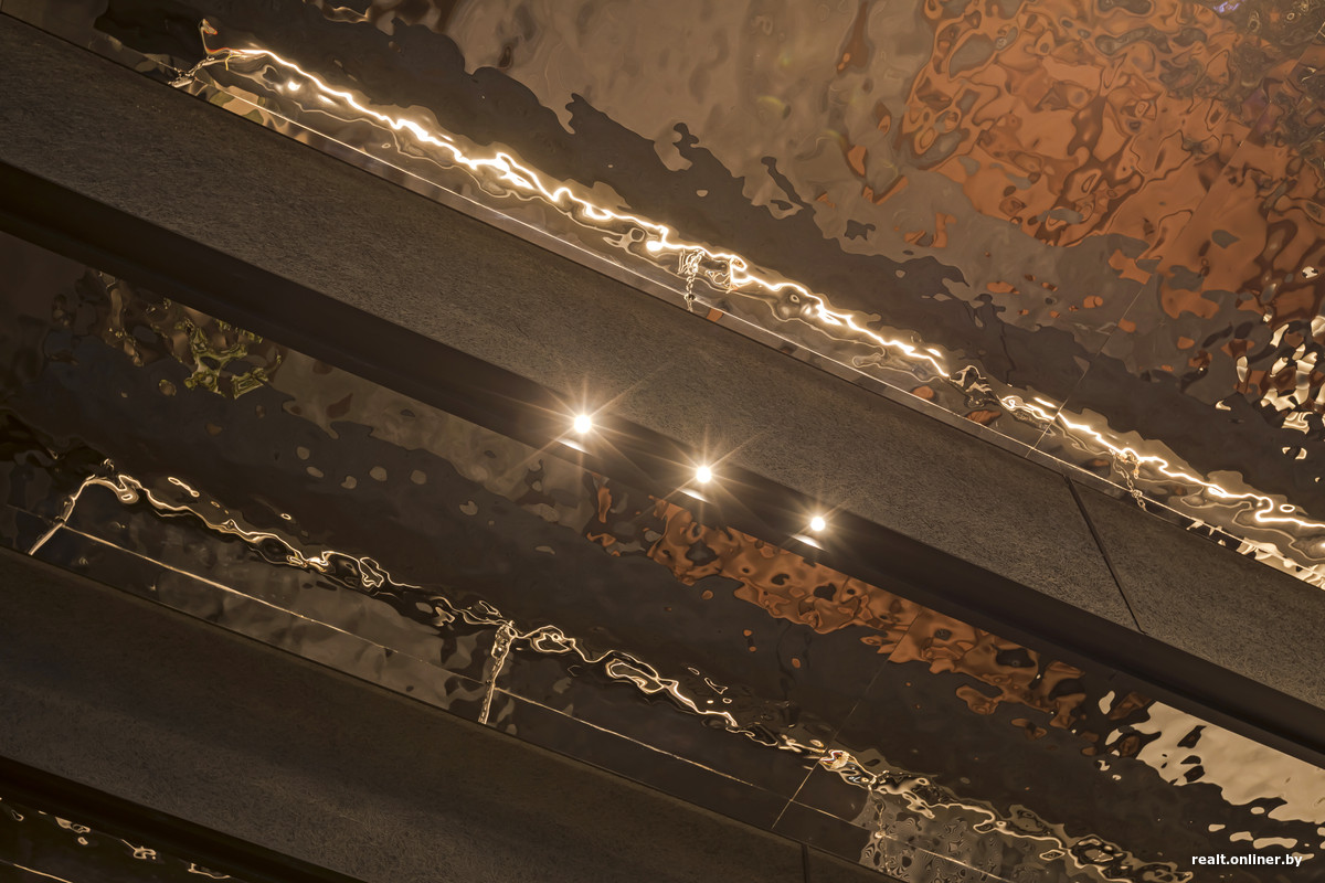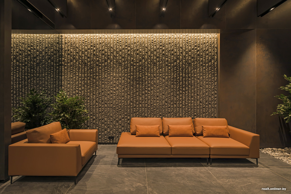 — В местах общего пользования четко прослеживается стилистика архитектуры здания, — говорит Максим Сакольчик. — Внутри некоторых элементов мы повторили пластику, материалы и цветовую гамму фасадов. Темные оттенки выбраны специально, потому что они выглядят богаче и глубже. В отделке использованы широкоформатный керамогранит картенового цвета и 3D-панели с рельефом скал, потолок украшен глянцевой полированной сталью с эффектом ртути или воды.