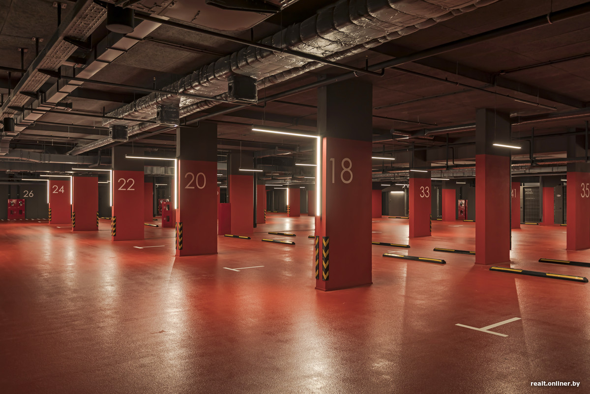 Паркинг тут тоже необычный: отапливаемый, выкрашенный в смелый красный цвет, со стильной подсветкой и музыкой.