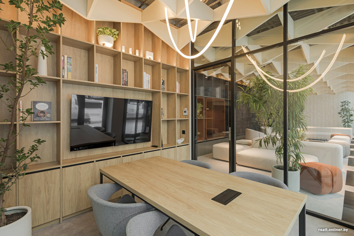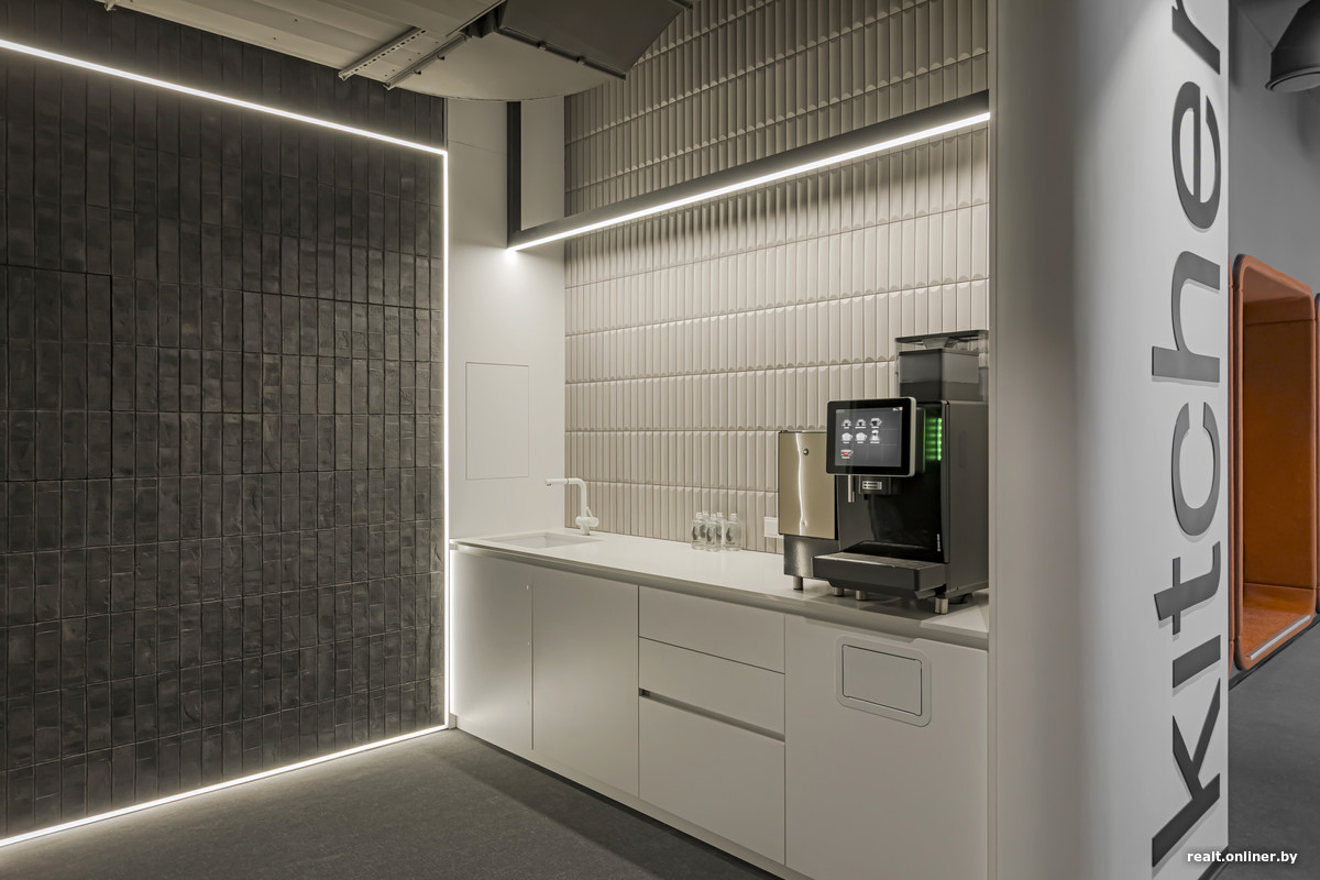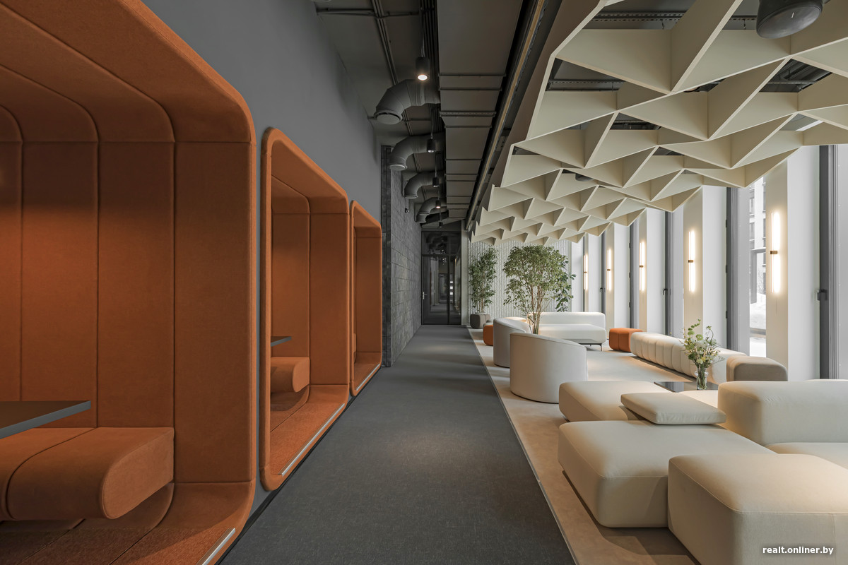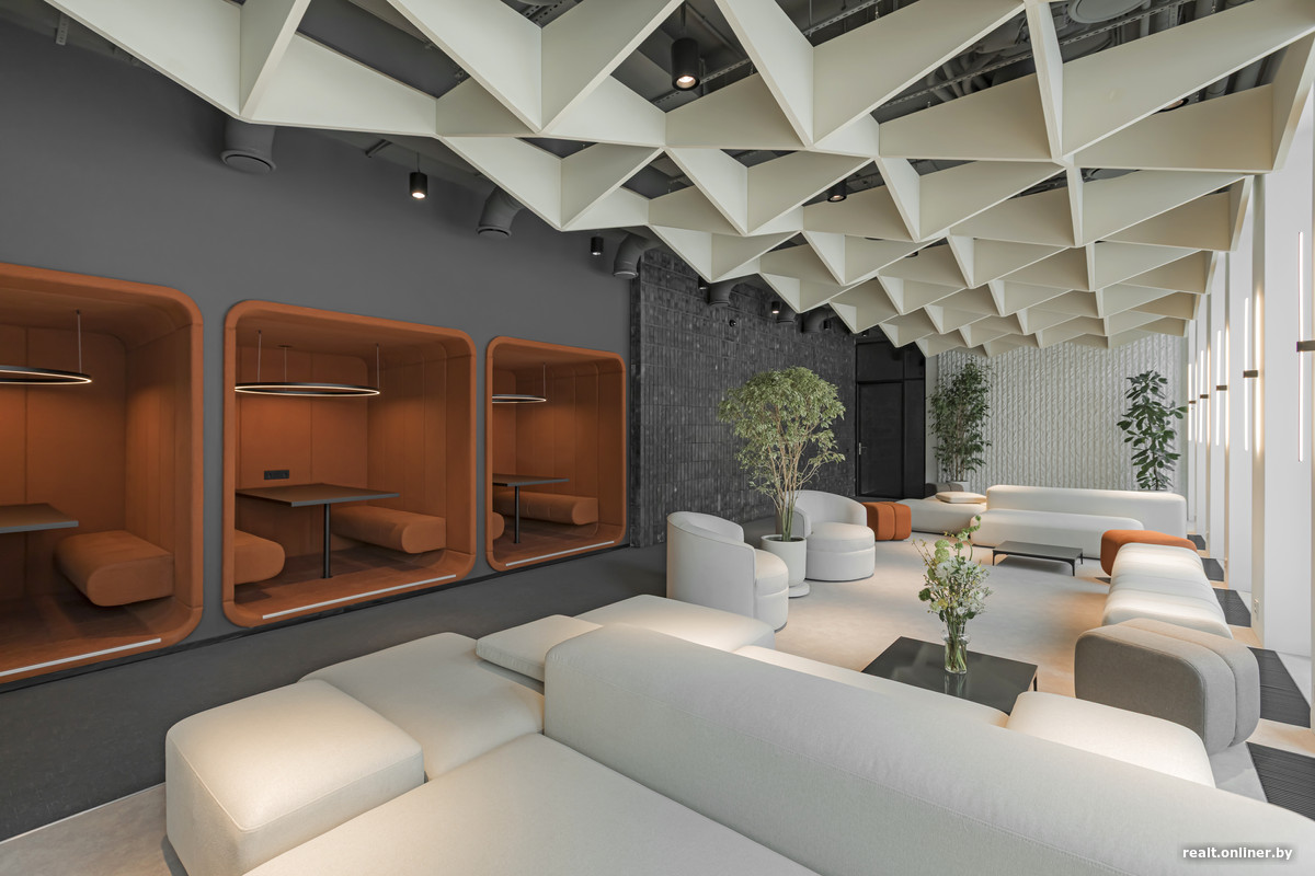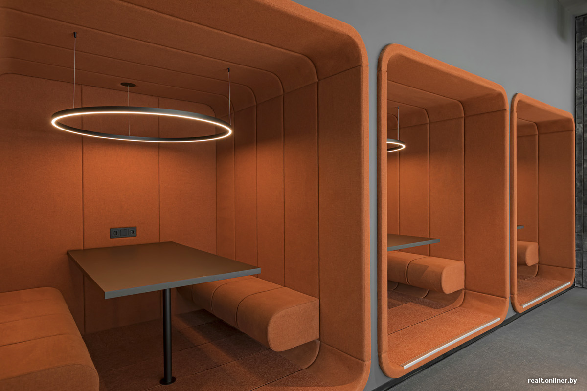 В клубе резидентов есть кухня с кофемашиной. Интересно выглядят капсулы для переговоров, выделенные цветом. Небольшая комната с телевизором и столом — это малая переговорная. В центре предусмотрена мягкая зона. Одну из ее частей можно отделить и затемнить для просмотра кино на выдвижном экране.