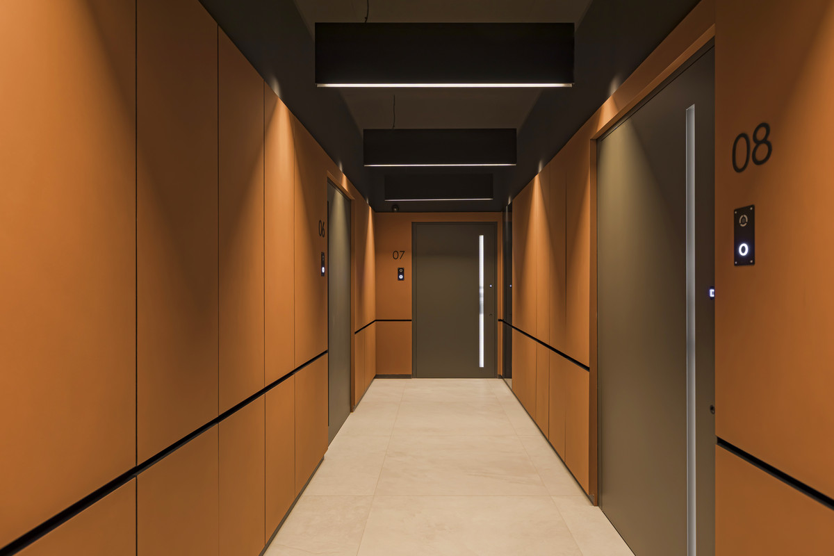 Площади лобби — 100 и 120 «квадратов». Приглушенный свет, темные оттенки, терракотовые акценты и ненавязчивая музыка — вот во что будут погружаться жильцы, возвращаясь домой.