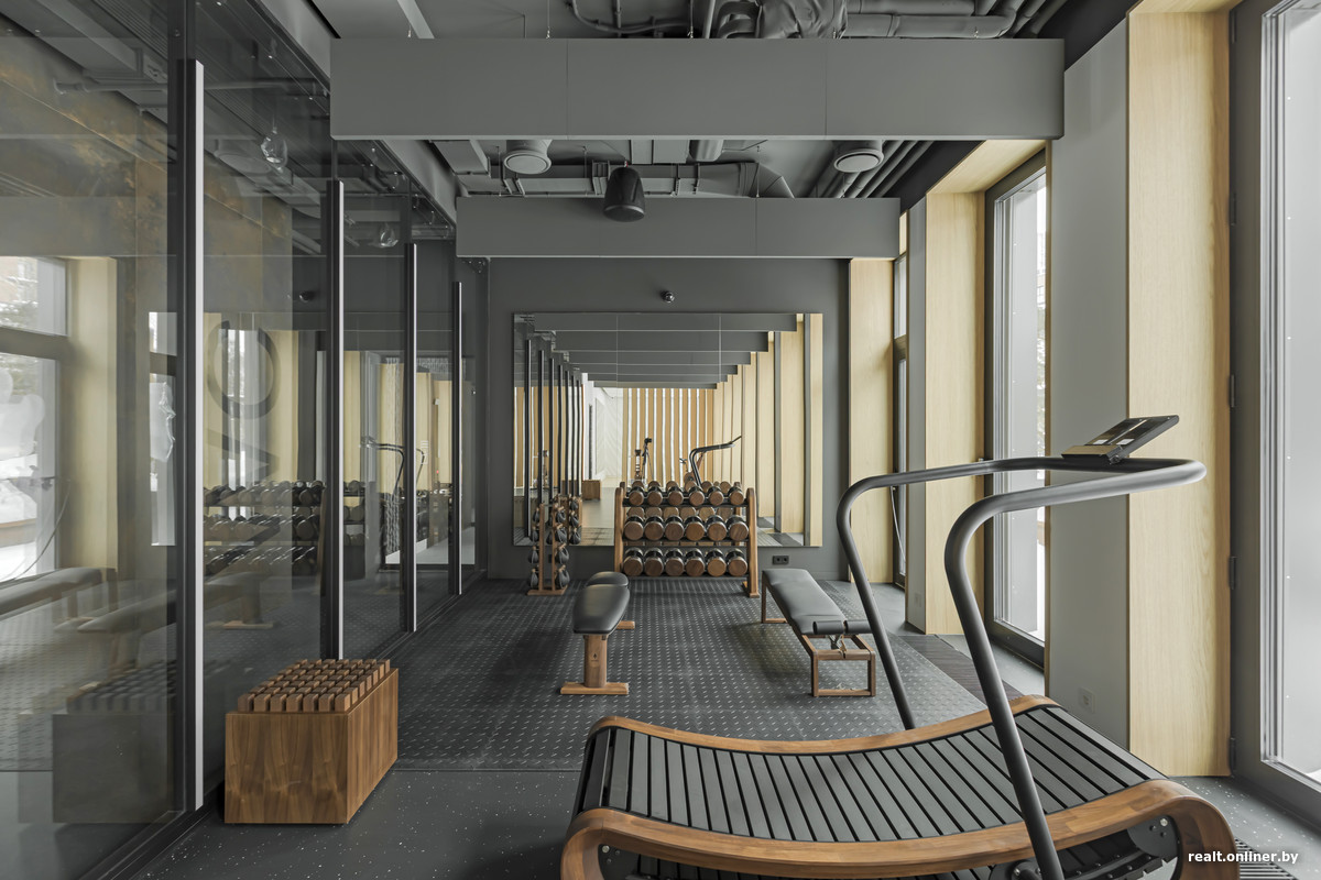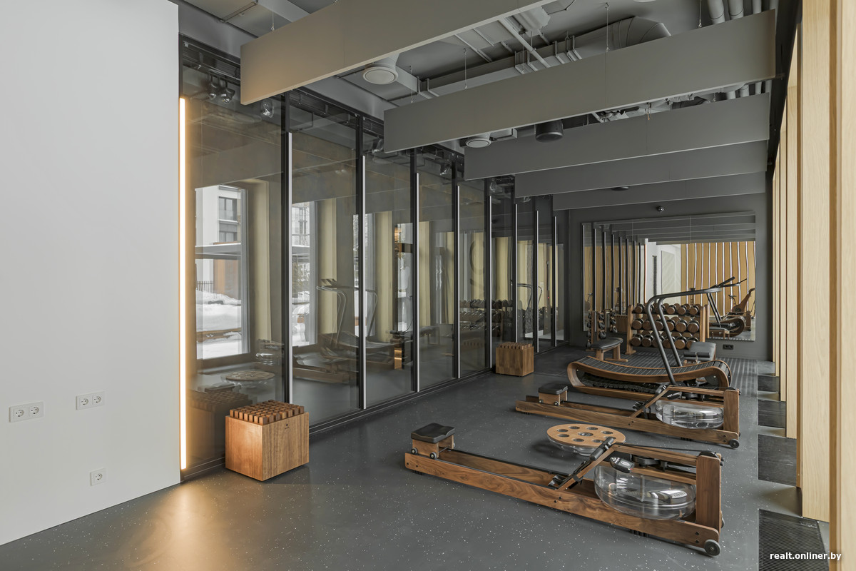 Есть фитнес-зал с большой зеркальной стеной. Это помещение имеет панорамное остекление и удивляет непривычными глазу деревянными тренажерами. Наталья объясняет: