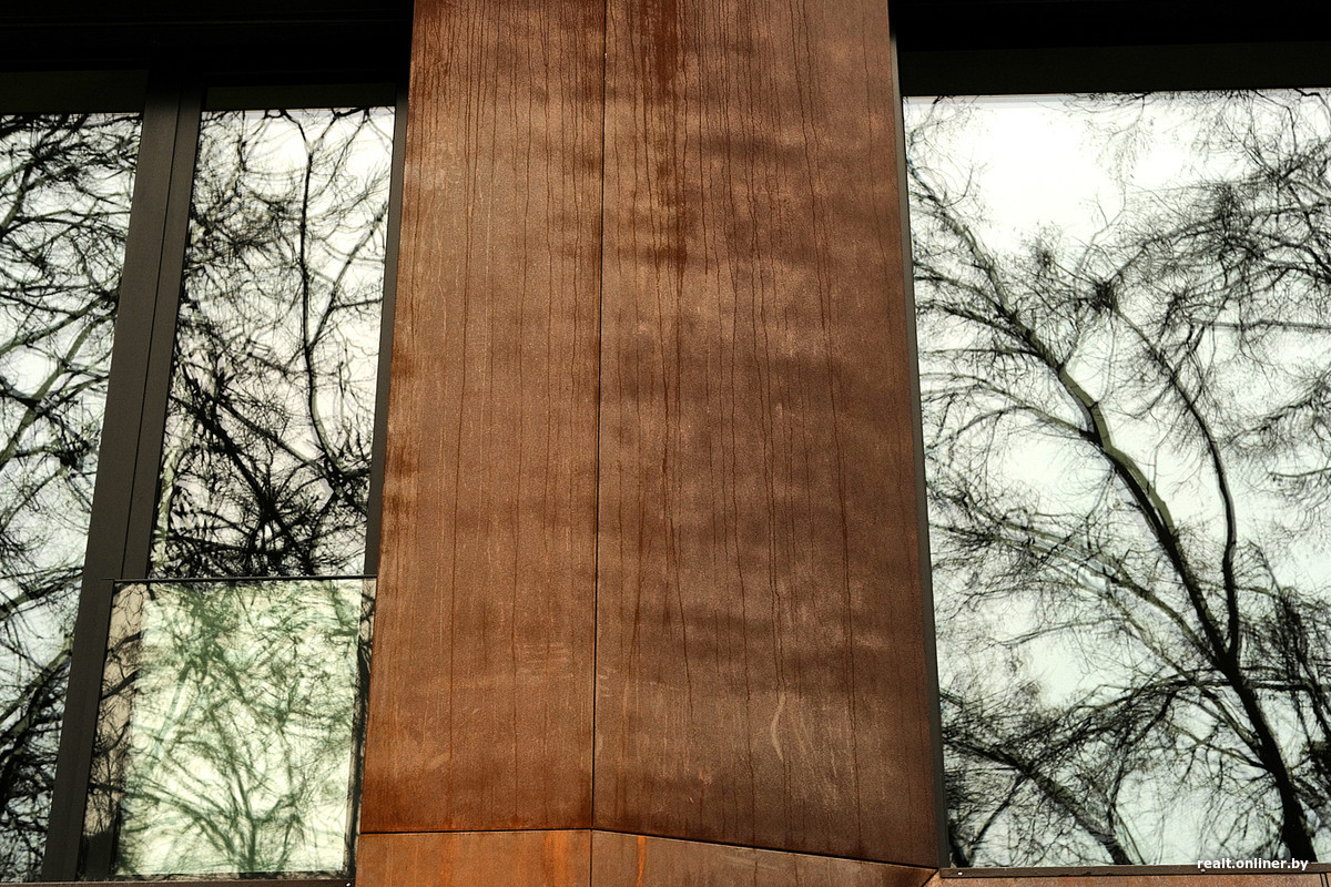 Облицовочный кирпич мы привозили из Германии. Он уложен грамотными специалистами. Я приходил и контролировал даже толщину замазки шва, выбирал из 3—4 вариантов, чтобы достигнуть максимальной выразительности. Кортен — это уникальный и долговечный материал, который ржавеет и постоянно меняется. Но мы его покрыли специальным лаком, стабилизировали, остановили старение, и теперь внешне он всегда будет одинаковым.