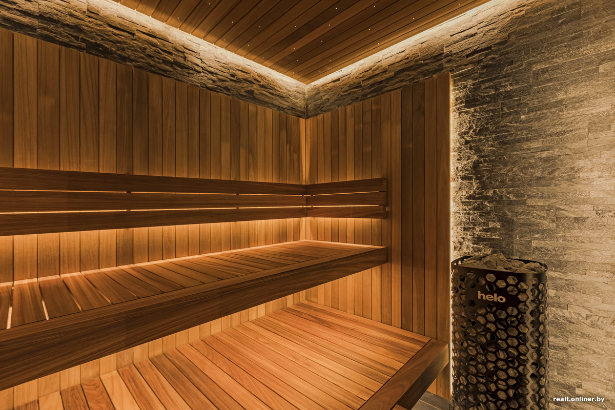 Реализована и мечта тех, кто любит попариться: для резидентов доступна спа-зона с финской сауной, душевыми и раздевалками. Забронировать сауну можно через консьержа — сделано это для того, чтобы избежать толкучки. Потолок напоминает звездное небо — такая отсылка к Rolls-Royce.