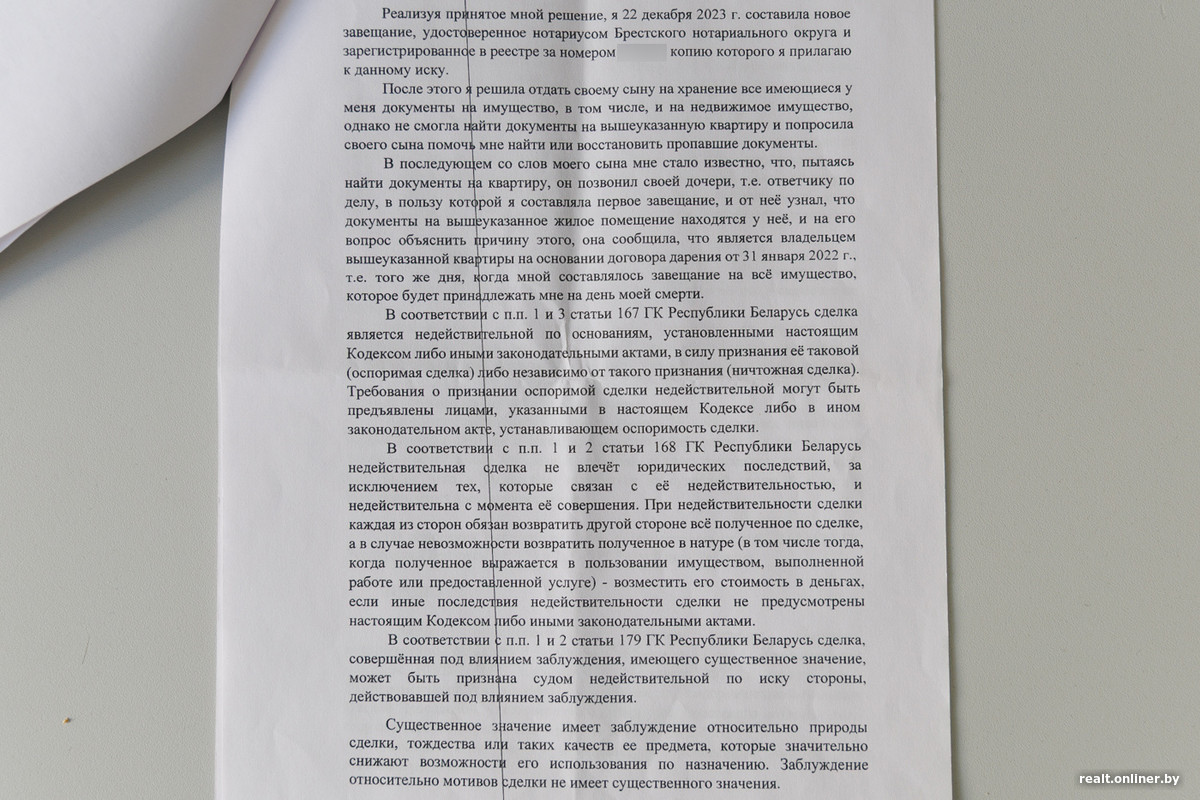— Через пару дней после этого мне в тайне позвонила бабушка и сказала, что отец хочет отсудить квартиру. Это было 6 декабря 2024 года. Мы были в шоке. В январе 2025-го мы приехали к бабушке с мужем и мамой и она опять предупредила о намерениях сына. Что сделали мы? Почитали законы. Узнали, что договор дарения не имеет обратной силы, и успокоились.