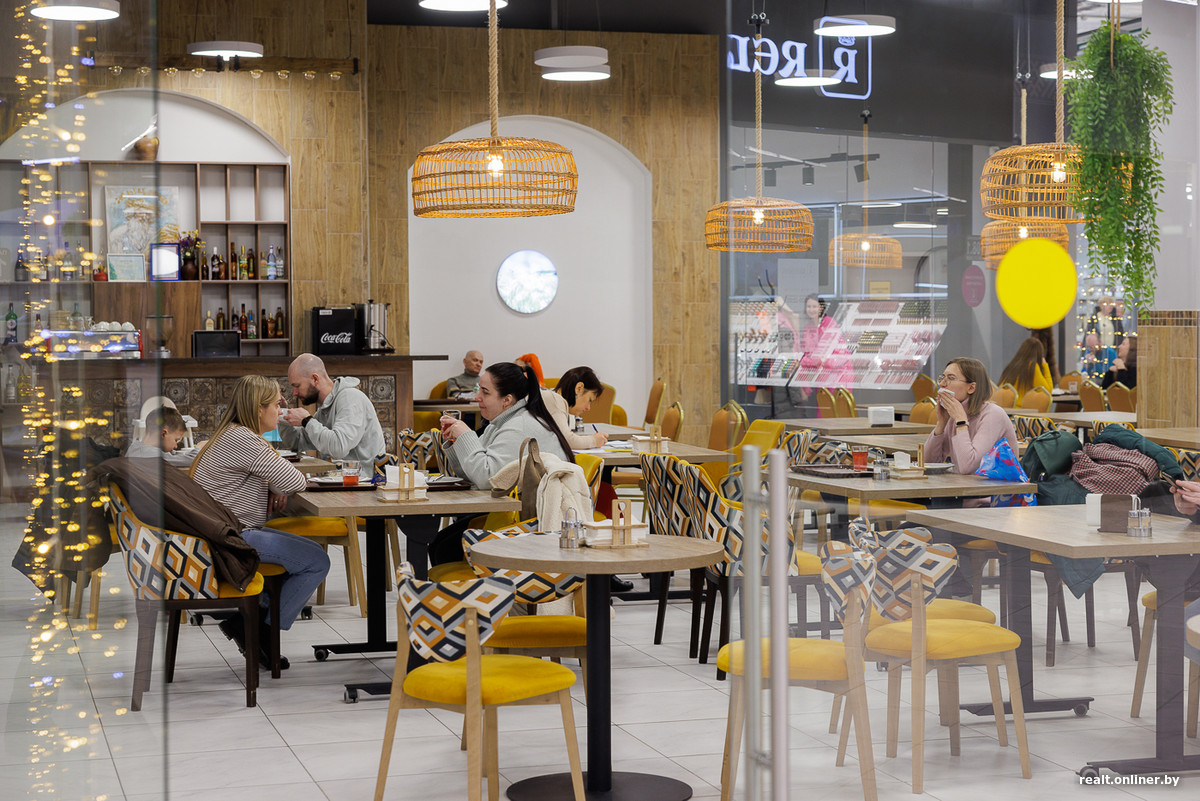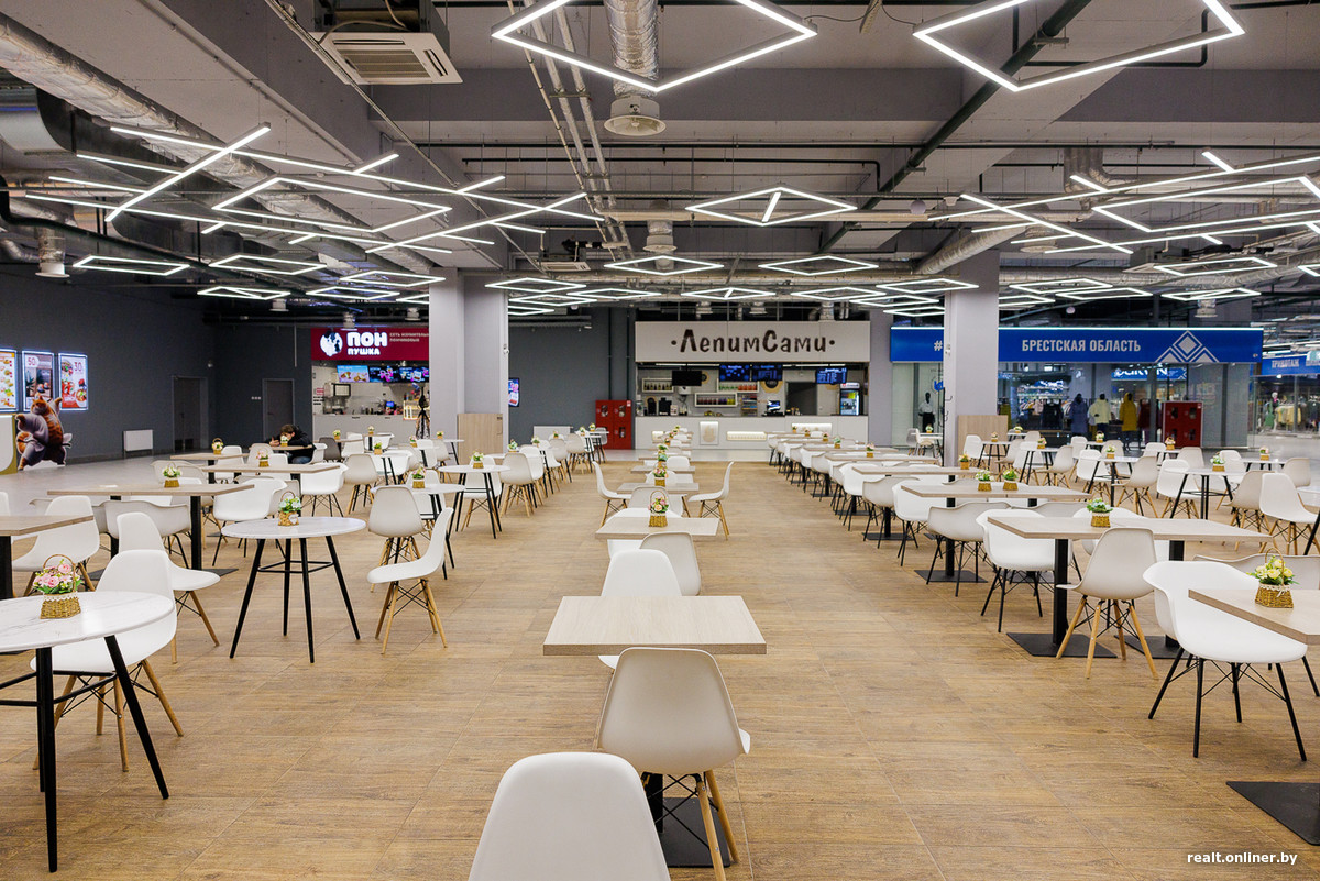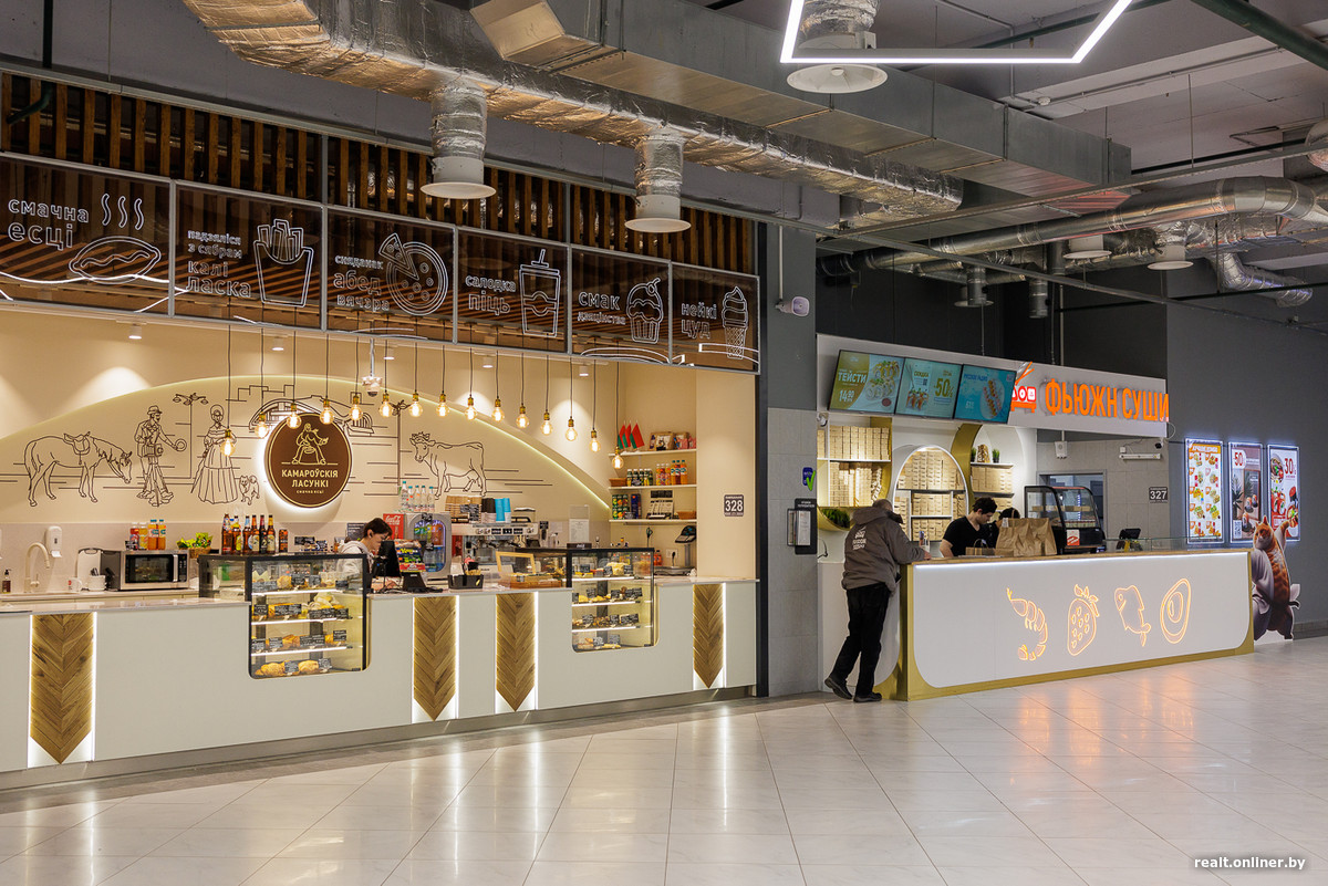 На третьем этаже находится небольшой фудкорт. Здесь представлена не только белорусская кухня: есть пельмени от «Лепим сами», пончики Pon Pushka, суши от Fusion Sushi, выпечка от «Камароўскія ласункі».