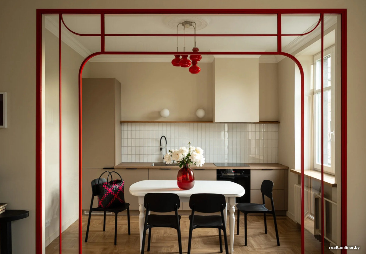 В центре — овальный обеденный стол, над которым висит красный винтажный светильник, еще один цветной акцент в интерьере. Белая поверхность стола визуально облегчает пространство, а черные стулья добавляют графичности и создают четкий контраст. Столешница кухни и дубовый подоконник добавляют уюта: дерево здесь работает не только как декоративный элемент, но и как тактильно приятный объект.